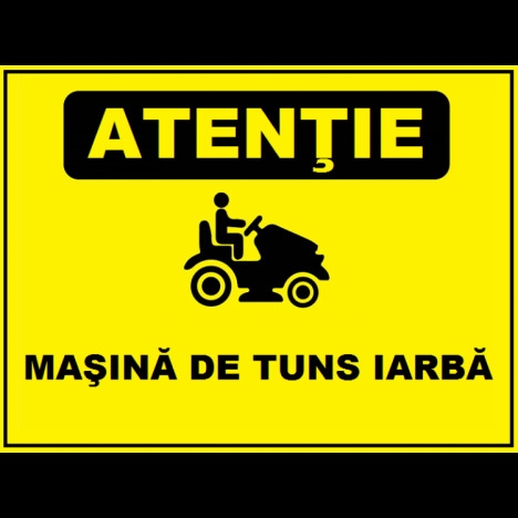 Vand Placuta pentru masina de tuns iarba la un pret foarte avantajos! Placuta pentru masina de tuns iarba Va putem oferi si alte dimensiuni, materiale sau modele separat la cerere. Noua modalitate de imprimare UV pentru semne si indicatoare este cea mai recenta tehnologie UV. Aceasta tehnica este mult mai eficienta decat o tehnica obisnuita de imprimare digitala. Atat calitatea sa net superioara, cat si versatilitatea sa la imprimarea diferitelor produse sunt foarte mari si largi O imprimare UV consta intr-o tehnica de imprimare prin care cerneala este aplicata pe un material sau obiect care urmeaza sa fie imprimat, care este apoi uscata instantaneu de un emitator de raze ultraviolete. Multe tipuri de compusi sunt folosite pentru a acoperi intreaga suprafata imprimata, inclusiv carbonat de calciu si caolinit. Aceasta imprimare UV este o metoda de imprimare digitala cu o noua tehnica care usuca cerneala. Poate fi folosit pe o gama larga de materiale, astfel incat poate imprima pe plastic, metal, hartie, carton, placi ceramice, sticla, lemn si multe altele. Disponibil: - Autocolant PVC - forex industrial - Dibond din aluminiu. - www.prevenirea.ro Telefon : 0724 306 714