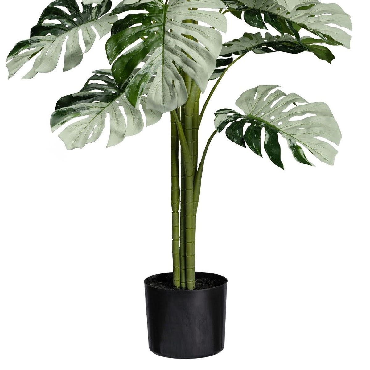 Planta artificiala Monstera Variegata Halfmoon cu 16 frunze artificiale verde-alb in ghiveci negru din plastic. Dimensiunea ghiveciului 15x13 cm.