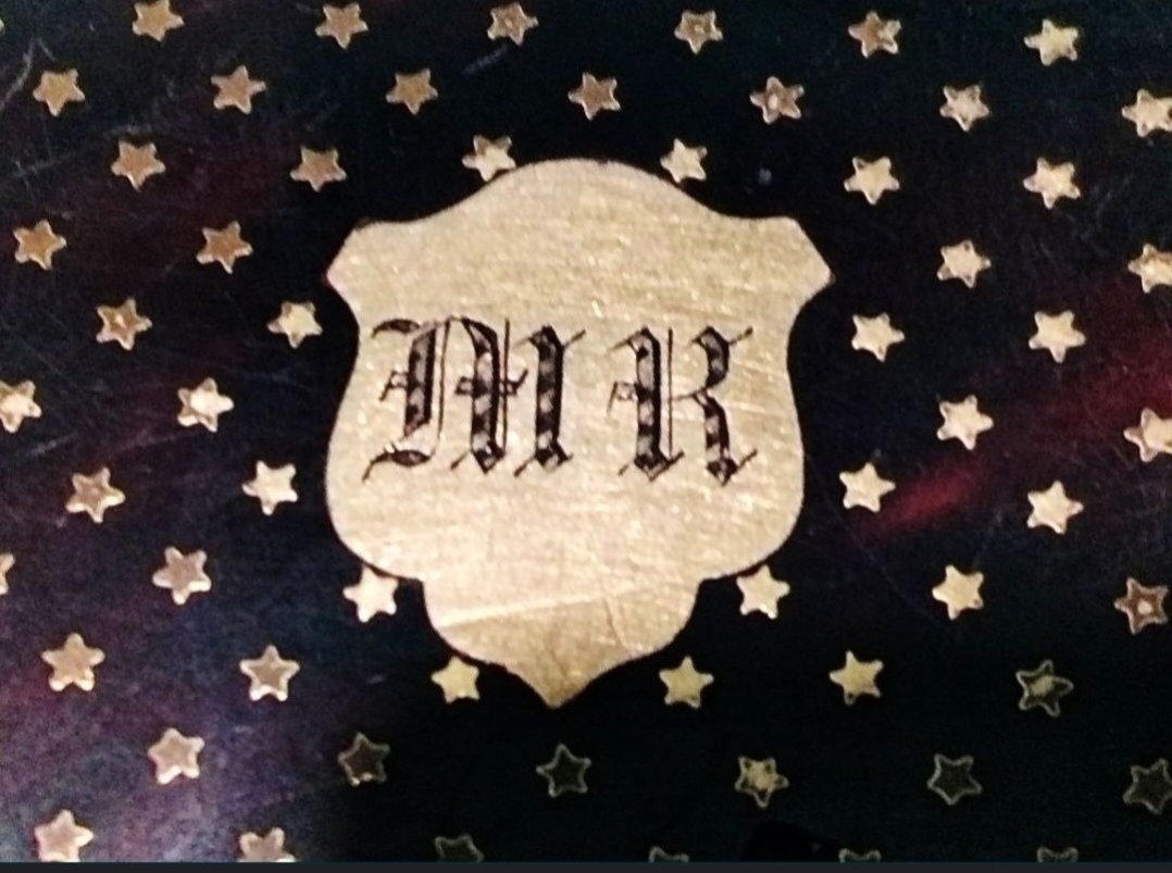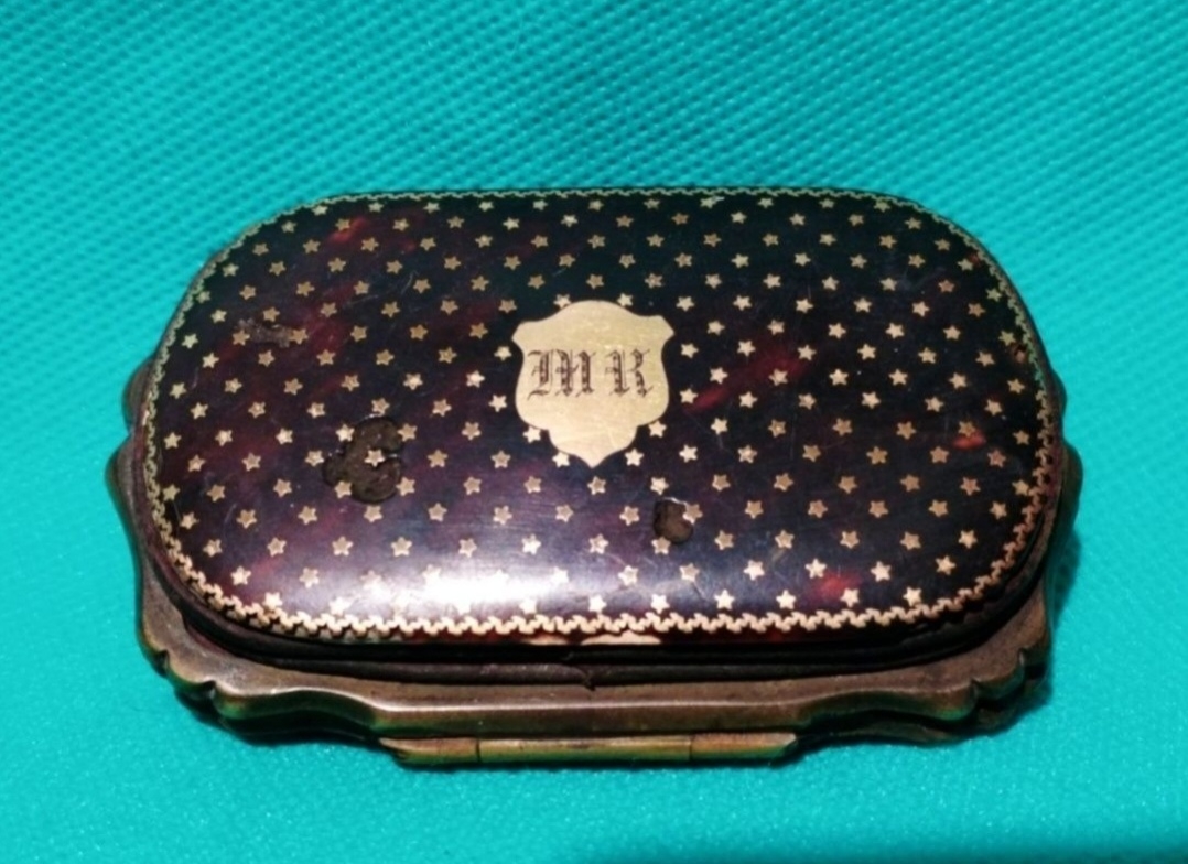 Obiect de lux victorian, portofel din carapace de broasca testoasa cu blazon din aur in stil heraldic si personalizat cu initiale in stil gotic.