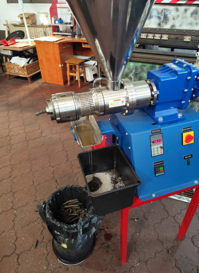 Presa de ulei la rece, alimentare 220V, motor 2.2 kW, rezistenta electrica 0.8 kW, capacitate de 19-40 kg pe ora, produce intre 6.8 si 10 litri de ulei brut.