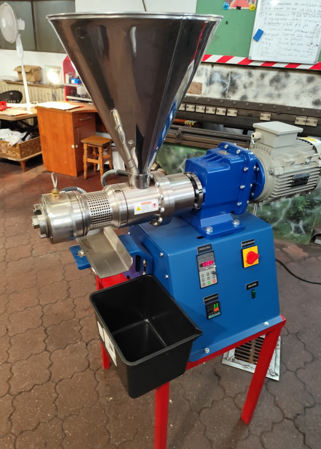 Aparat de presare ulei la rece, alimentare 220V, capacitate 14.6 - 20 kg seminte pe ora, cu o putere de 2.1 kW si productie de 4.8 - 6 litri pe ora.