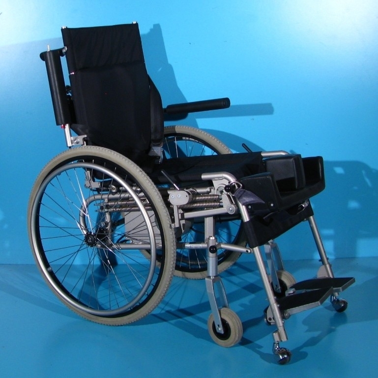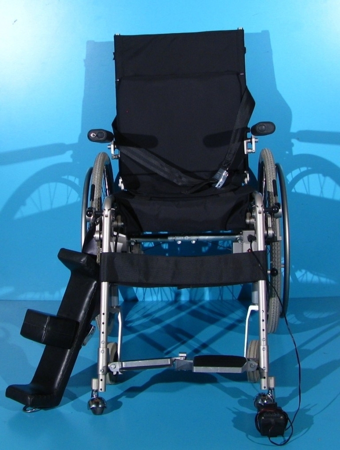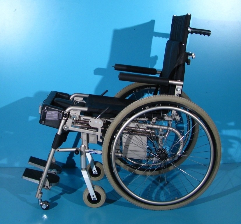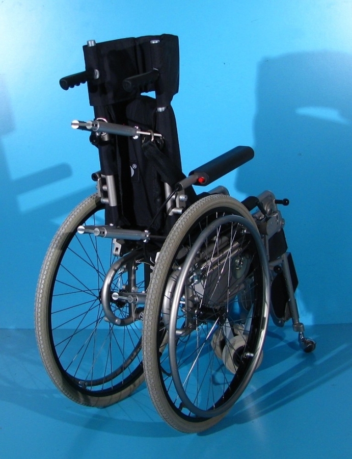 Scaun cu rotile pliabil cu verticalizare electrica second-hand destinat persoanelor cu afectiuni locomotorii.