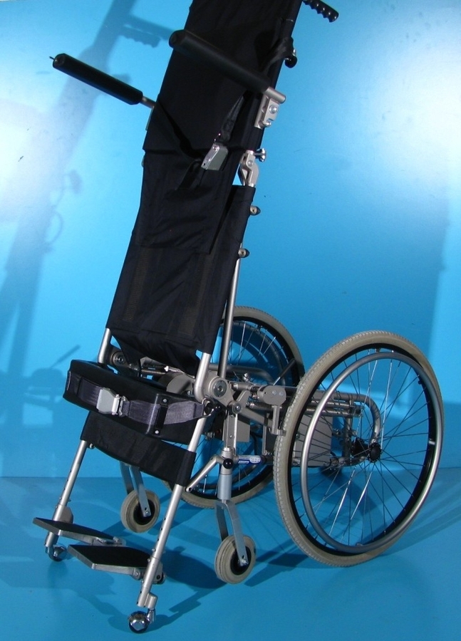 Scaunul cu verticalizare dispune de suport pentru genunchi detasabil, frane pentru pacient, cotiere rabatabile, centura de siguranta torace.