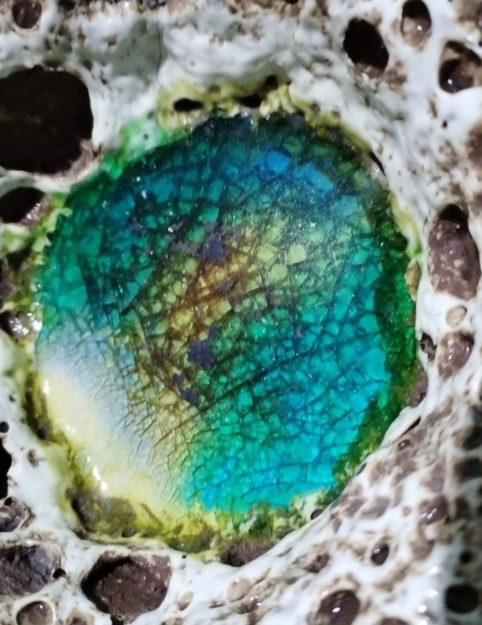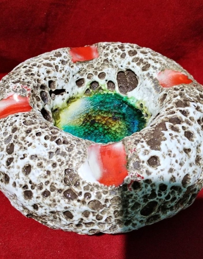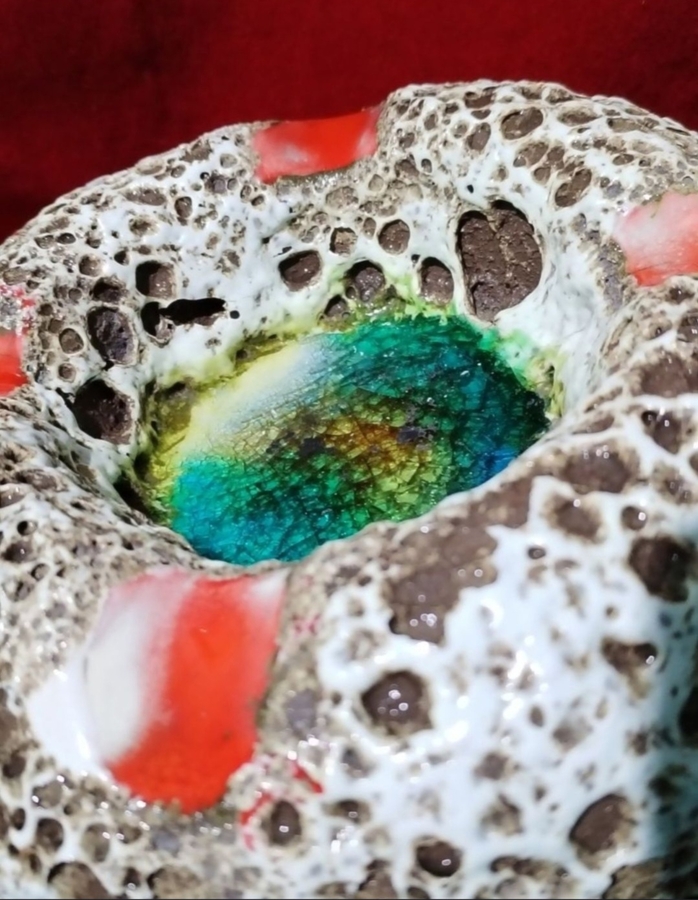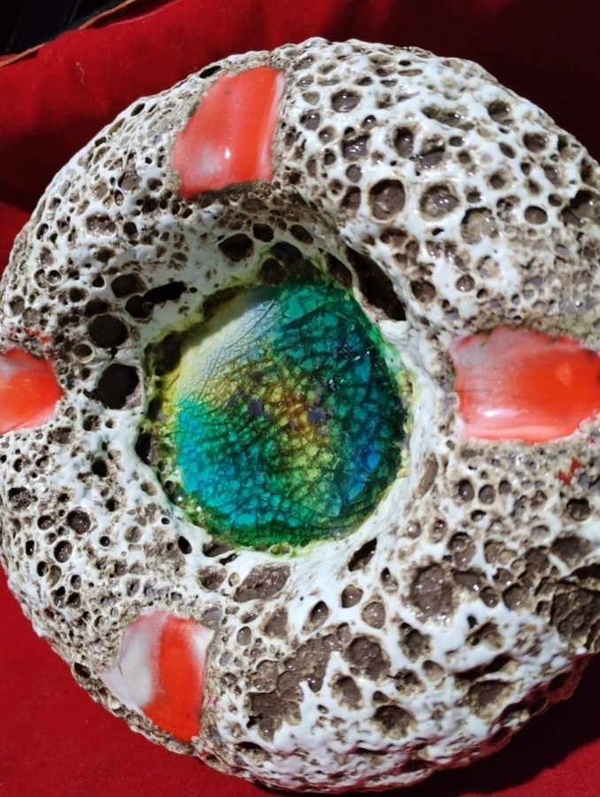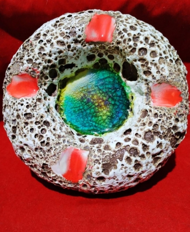 Acest frumos obiect decorativ se distinge prin textura sa bruta, de samota, care aminteste de lava, si prin glazurile sale vibrante, o inima verde- albastru turcoaz cu efect crapat, inconjurata de patru zone glazurate rosu aprins.