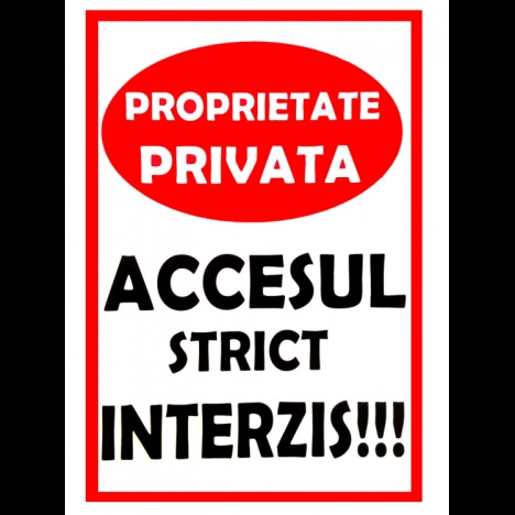 Vand Semn de proprietate privata si accesul strict interzis la un pret foarte avantajos! Semn de proprietate privata si accesul strict interzis Va putem oferi alte dimensiuni, materiale sau modele separat la cerere. Noua modalitate de print UV pentru semne si indicatoare este de ultima tehnologie UV . Aceasta tehnica este mult mai performanta decat o tehnica obisnuita de printare digitala. Atat calitatea sa net superioara, cat si versarilitatea sa pe imprimarea diferitelor produse este foarte mare si larga Un print UV consta intr-o tehnica de printare prin care cerneala se aplica pe un material sau obiect de imprimat, care este apoi uscata instant de catre un emitator de raze ultraviolet. Pentru a acoperi toata suprafata printata sunt utilizate numeroase tipuri de compusi, incluzand carbonatul de calciu si caolinitul. Aceasta imprimare UV este o maniera de imprimare digitala cu o tehnica noua care usuca cerneala. Se poate folosi pe o gama larga de materiale, astfel incat se poate imprima pe plastic, metal, hartie, carton, placi ceramice, sticla, lemn si multe altele. ? Autocolant industrial UV pentru semne si indicatoare ? Folie adeziva din PVC polimeric, utilizata in special la exterior, pentru decorarea suprafetelor drepte, etc; ? Grosimea este de 90 microni. ? Adezivul este pe baza de poliacrilat, permanent. ? pentru interior si exterior. ? Suprafata foliei este integral colorata, lucioasa (59 de culori) sau mata (56 culori). ? Placi forex industrial UV industrial pentru semne si indicatoare cu suprafata tare, lucioasa, bun izolator termic si fonic, rezistenta mare la agenti naturali si corozivi, flamabilitate redusa. ? Gama de culori disponibile in permanenta in stoc: rosu, albastru inchis, albastru deschis, negru, galben inchis, galben deschis, gri, verde. ? Placile din PVC compact industrial au suprafata dura si lucioasa. Se recomanda folosirea acestor placi atat pentru aplicatii indoor, cat si pentru aplicatii outdoor, datorita proprietatii materialului de a fi un bun izolator termic si fonic. Placile din PVC compact sunt vacuumabile si termoformabile. ? Grosimi disponibile in permanenta in stoc: 2mm; 3mm. ? Placi bond industrial uv pentru semne si indicatoare ? placi sandwich aluminiu cunoscute si sub denumirile comerciale de alucobond, alubond si dibond. ? Utilizate pentru placari fatade, placari interioare, placari exterioare. ? Este un material cu doua fete din aluminiu si un miez din polietilena ce inlocuieste cu succes tabla, lambriurile sau placajele plastice. ? Miezul este fixat prin aderenta pe fetele din tabla, pe toata suprafata. ? Tabla este vopsita in minim doua straturi, peste care se aplica un strat de lac protector compatibil cu vopseaua. ? Panourile pot avea o singura fata decor sau ambele fete colorate ? ? Placile sunt foarte usor de prelucrat, putand fi personalizate prin laminare, serigrafiere, tipar digital si lacuire, fiind usor de intretinut si avand o durata sporita de viata.. www.prevenirea.ro - 0724 306 714. Va rugam sa selectati dimensiunea potrivita pentru dvs.