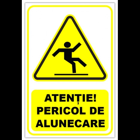 Vand Semn pentru pericole de alunecari la un pret foarte avantajos! Semn pentru pericole de alunecari Va putem oferi alte dimensiuni, materiale sau modele separat la cerere. Noua modalitate de print UV pentru semne si indicatoare este de ultima tehnologie UV . Aceasta tehnica este mult mai performanta decat o tehnica obisnuita de printare digitala. Atat calitatea sa net superioara, cat si versarilitatea sa pe imprimarea diferitelor produse este foarte mare si larga Un print UV consta intr-o tehnica de printare prin care cerneala se aplica pe un material sau obiect de imprimat, care este apoi uscata instant de catre un emitator de raze ultraviolet. Pentru a acoperi toata suprafata printata sunt utilizate numeroase tipuri de compusi, incluzand carbonatul de calciu si caolinitul. Aceasta imprimare UV este o maniera de imprimare digitala cu o tehnica noua care usuca cerneala. Se poate folosi pe o gama larga de materiale, astfel incat se poate imprima pe plastic, metal, hartie, carton, placi ceramice, sticla, lemn si multe altele. ? Autocolant industrial UV pentru semne si indicatoare ? Folie adeziva din PVC polimeric, utilizata in special la exterior, pentru decorarea suprafetelor drepte, etc; ? Grosimea este de 90 microni. ? Adezivul este pe baza de poliacrilat, permanent. ? pentru interior si exterior. ? Suprafata foliei este integral colorata, lucioasa (59 de culori) sau mata (56 culori). ? Placi forex industrial UV industrial pentru semne si indicatoare cu suprafata tare, lucioasa, bun izolator termic si fonic, rezistenta mare la agenti naturali si corozivi, flamabilitate redusa. ? Gama de culori disponibile in permanenta in stoc: rosu, albastru inchis, albastru deschis, negru, galben inchis, galben deschis, gri, verde. ? Placile din PVC compact industrial au suprafata dura si lucioasa. Se recomanda folosirea acestor placi atat pentru aplicatii indoor, cat si pentru aplicatii outdoor, datorita proprietatii materialului de a fi un bun izolator termic si fonic. Placile din PVC compact sunt vacuumabile si termoformabile. ? Grosimi disponibile in permanenta in stoc: 2mm; 3mm. ? Placi bond industrial uv pentru semne si indicatoare ? placi sandwich aluminiu cunoscute si sub denumirile comerciale de alucobond, alubond si dibond. ? Utilizate pentru placari fatade, placari interioare, placari exterioare. ? Este un material cu doua fete din aluminiu si un miez din polietilena ce inlocuieste cu succes tabla, lambriurile sau placajele plastice. ? Miezul este fixat prin aderenta pe fetele din tabla, pe toata suprafata. ? Tabla este vopsita in minim doua straturi, peste care se aplica un strat de lac protector compatibil cu vopseaua. ? Panourile pot avea o singura fata decor sau ambele fete colorate ? ? Placile sunt foarte usor de prelucrat, putand fi personalizate prin laminare, serigrafiere, tipar digital si lacuire, fiind usor de intretinut si avand o durata sporita de viata.. www.prevenirea.ro - 0724 306 714. Va rugam sa selectati dimensiunea potrivita pentru dvs.