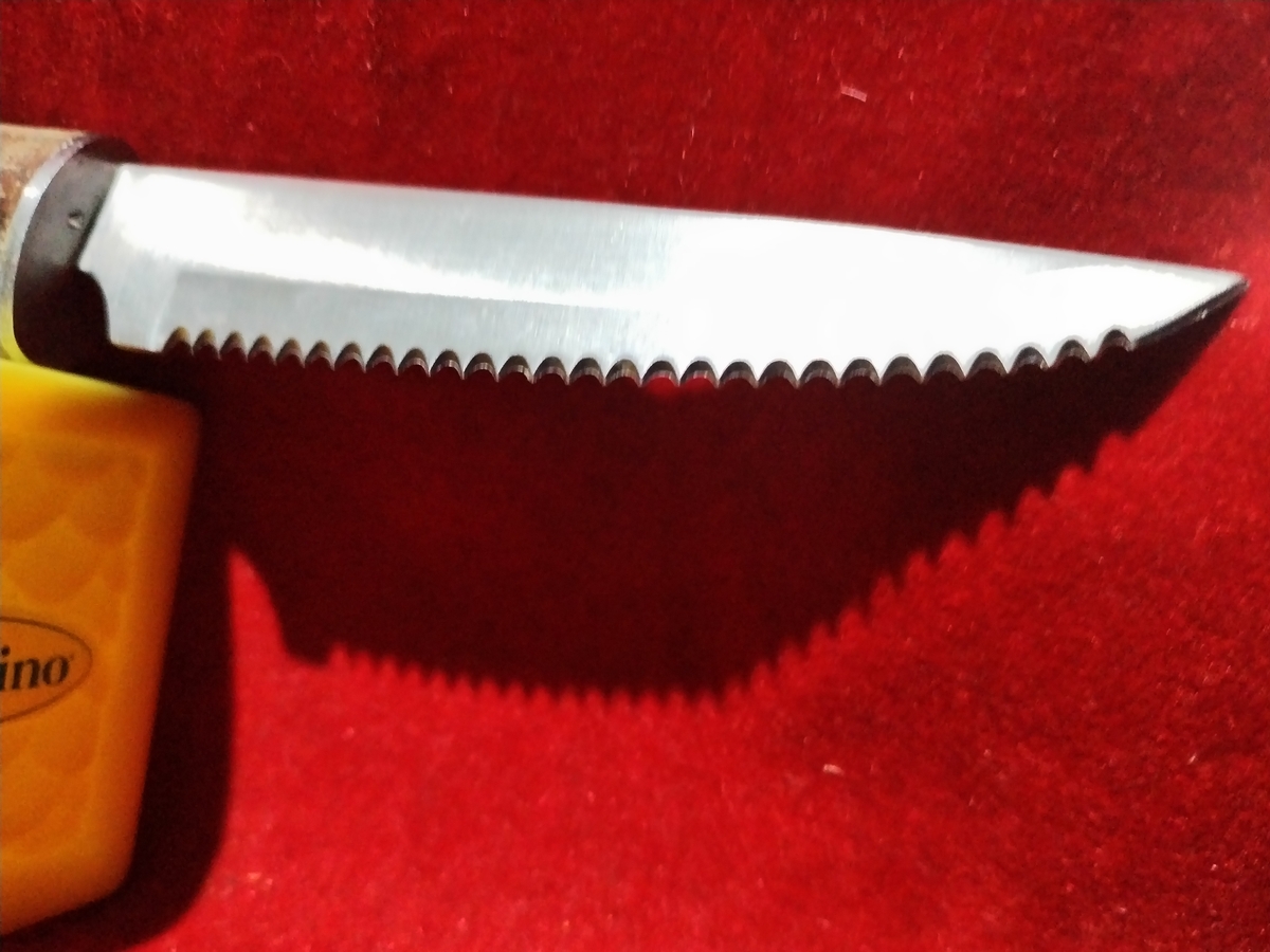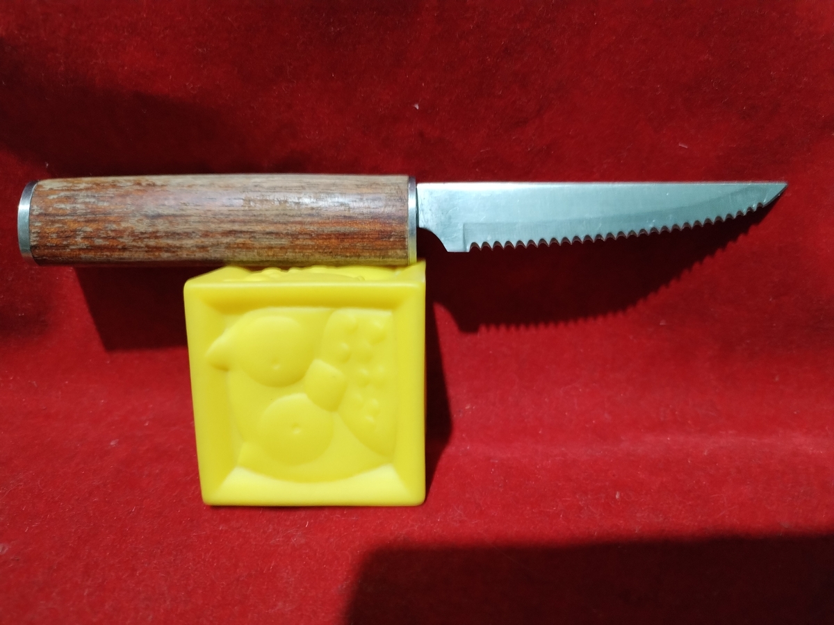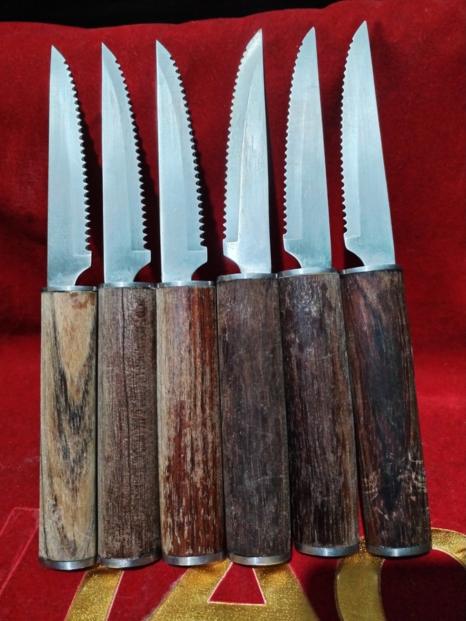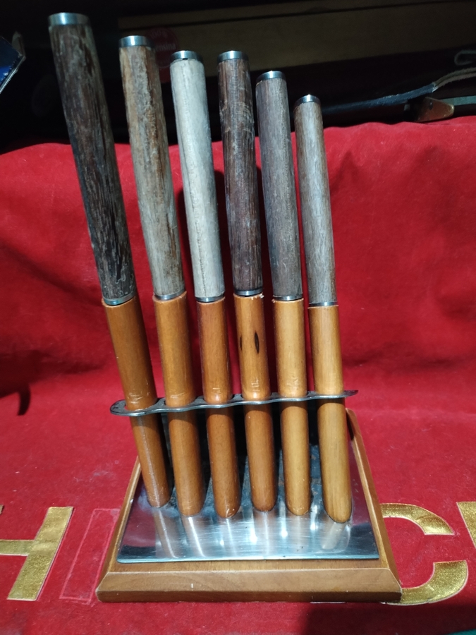Set complet format din sase cutite frantuzesti pentru friptura, cu suport, anii 1950-1960.