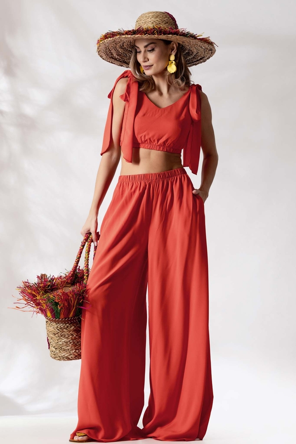 top cu bretele legate si pantaloni palazzo. Redescopera bucuria zilelor insorite cu acest set versatil si feminin, creat special pentru vara ta! Confortabil, aerisit si extrem de chic, setul este realizat din vascoza moale, cu o textura lejera care lasa pielea sa respire.
