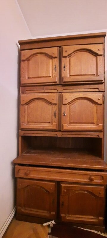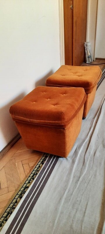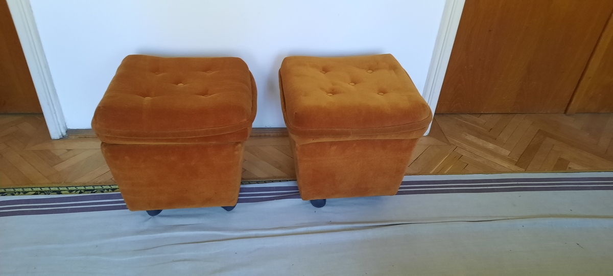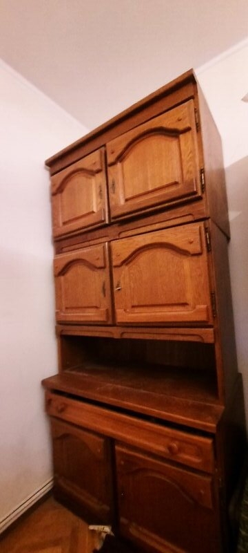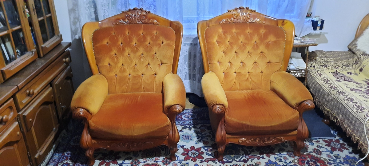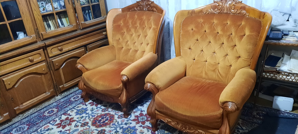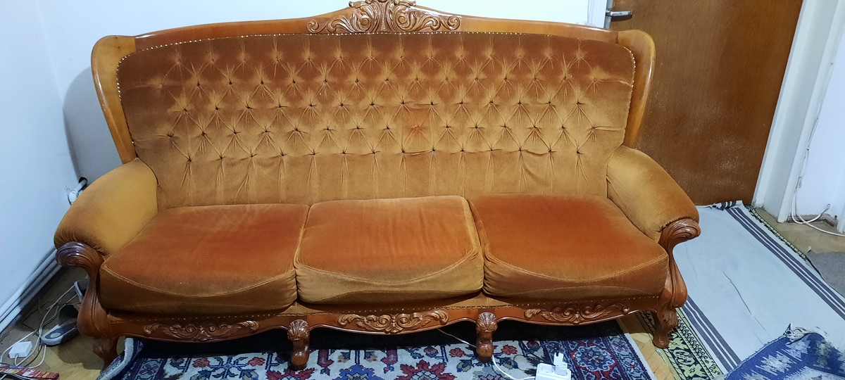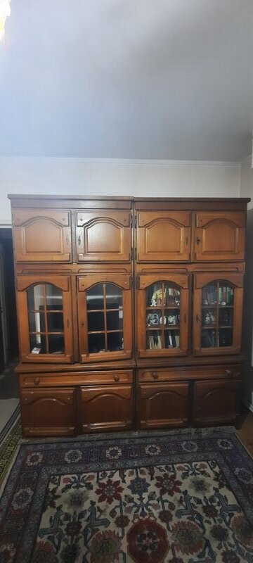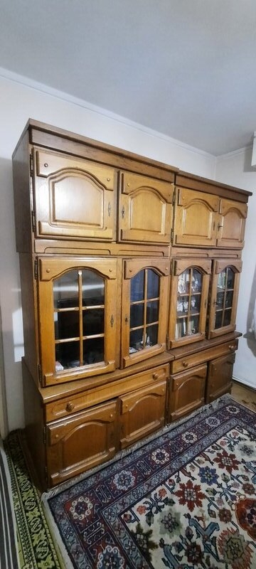 Set mo⁰bila Living lemn masiv: 3 corpuri biblioteca ( 2 cu vitrina), canapea fixa 3 locuri textil, 2 fotolii textil, 2 tabureti. Produsa aproximativ in anii '85-'87. Pastrata in buna stare.