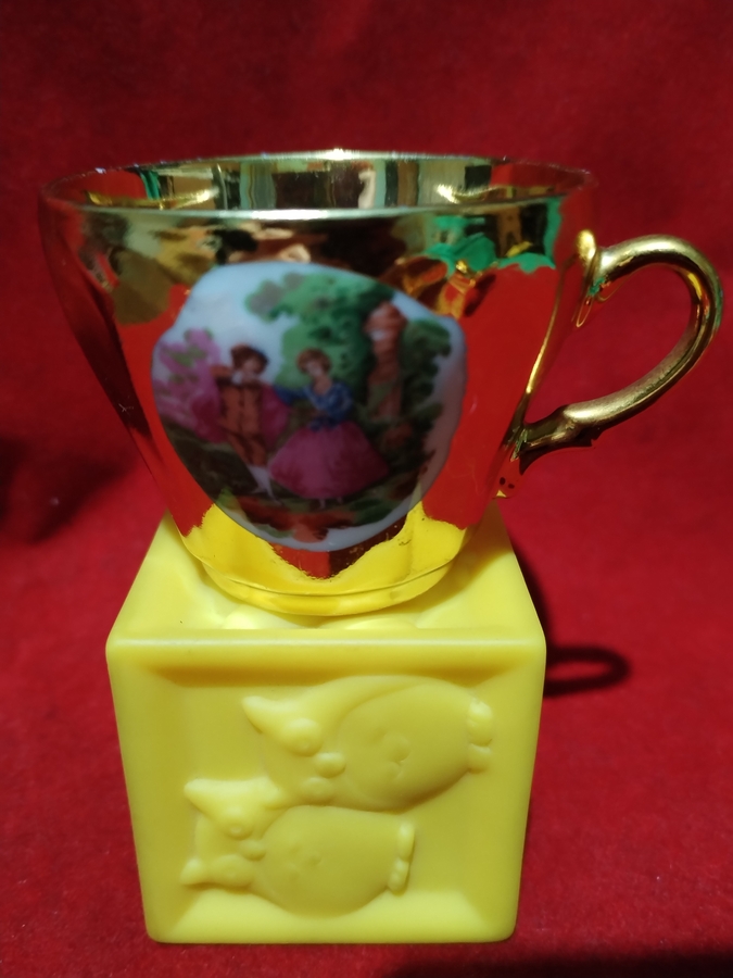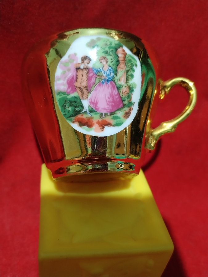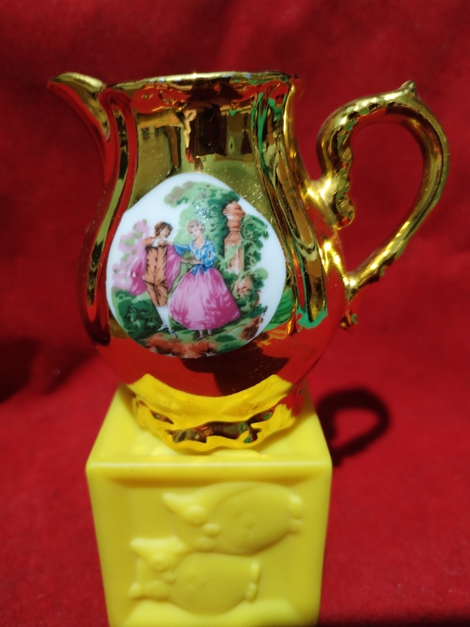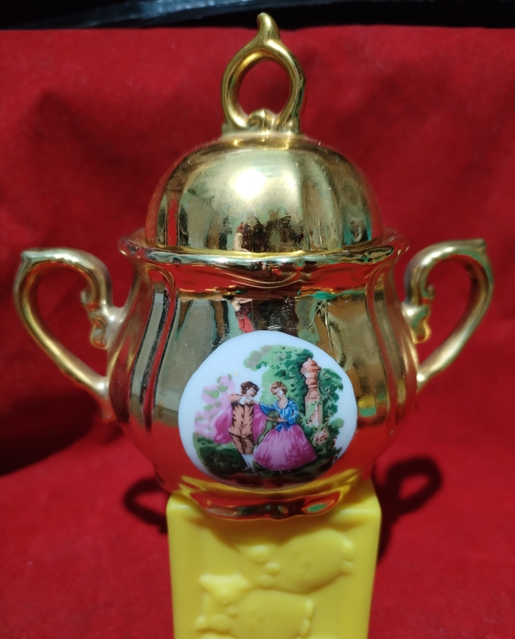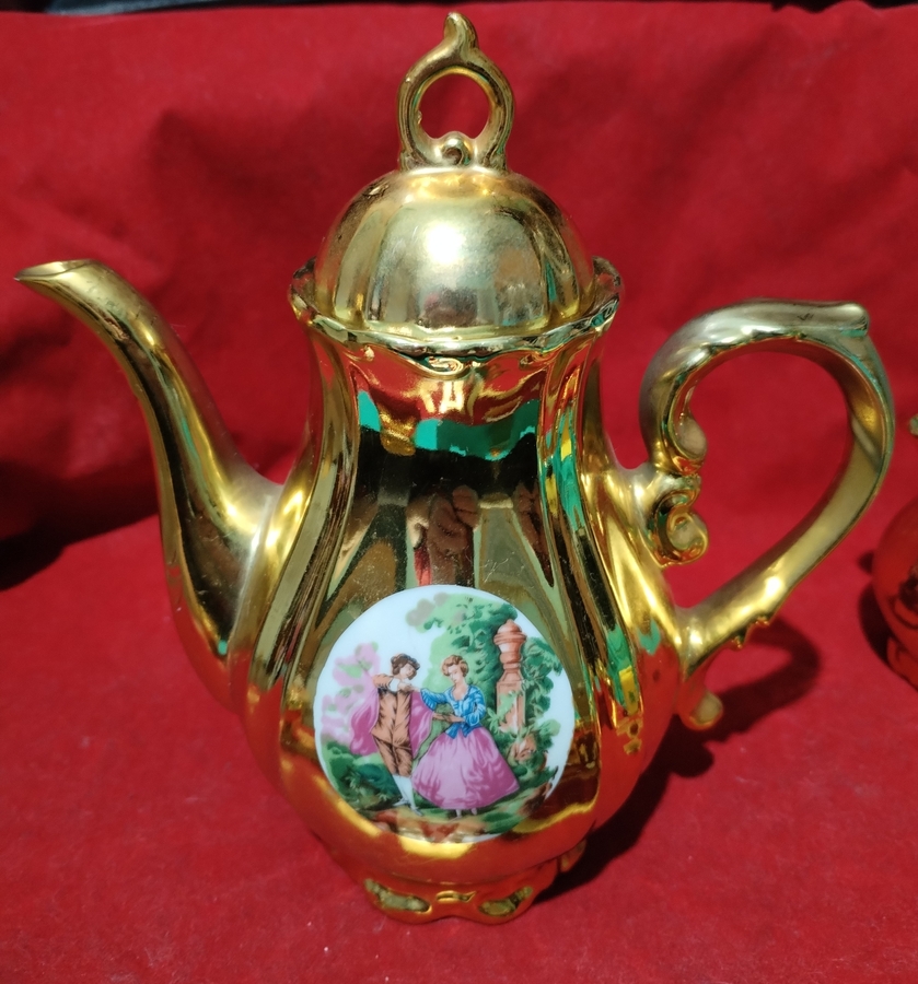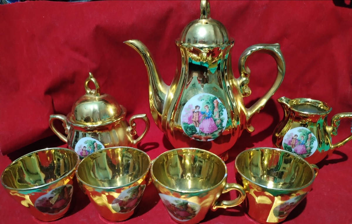 Set vintage japonez aurit, anii 1960-1970, decorat cu scene romantice Rococo.