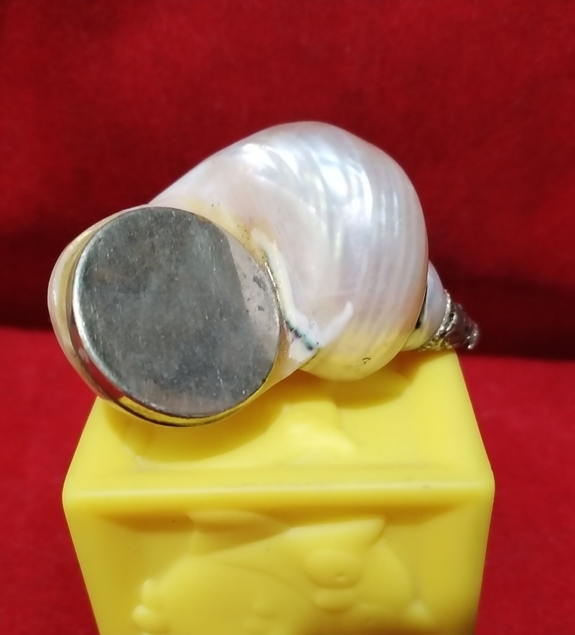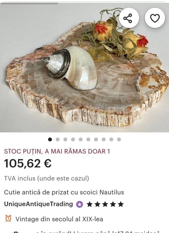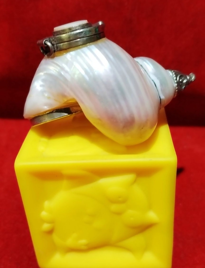 Piesa unica cu caracter atat functional cat si de colectie, tabachera de prizat tutun confectionata din scoica tip conch, montata elegant cu capace argintate.