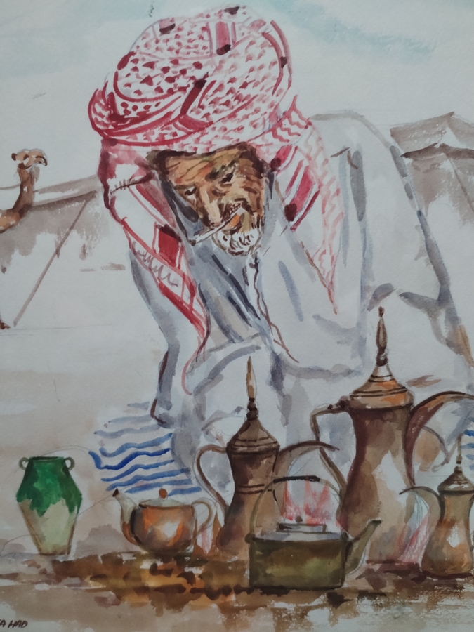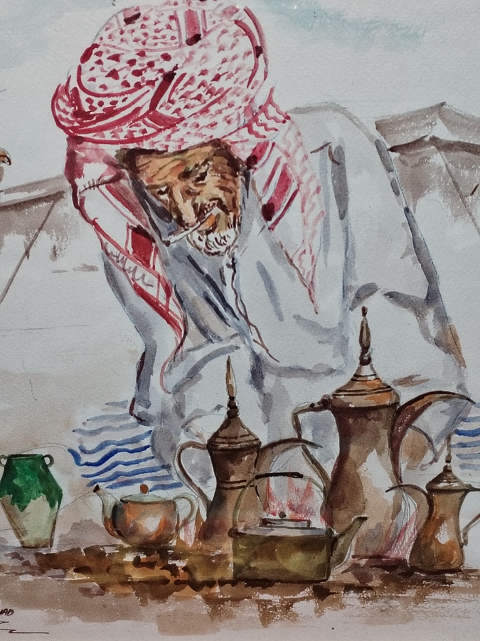 Tablou arab, acuarela semnata cu peisaj desertic nomad.