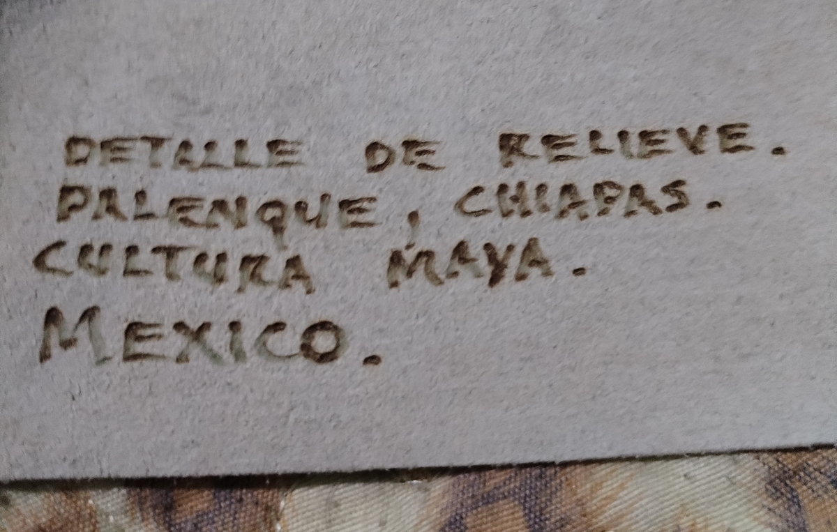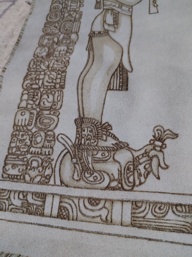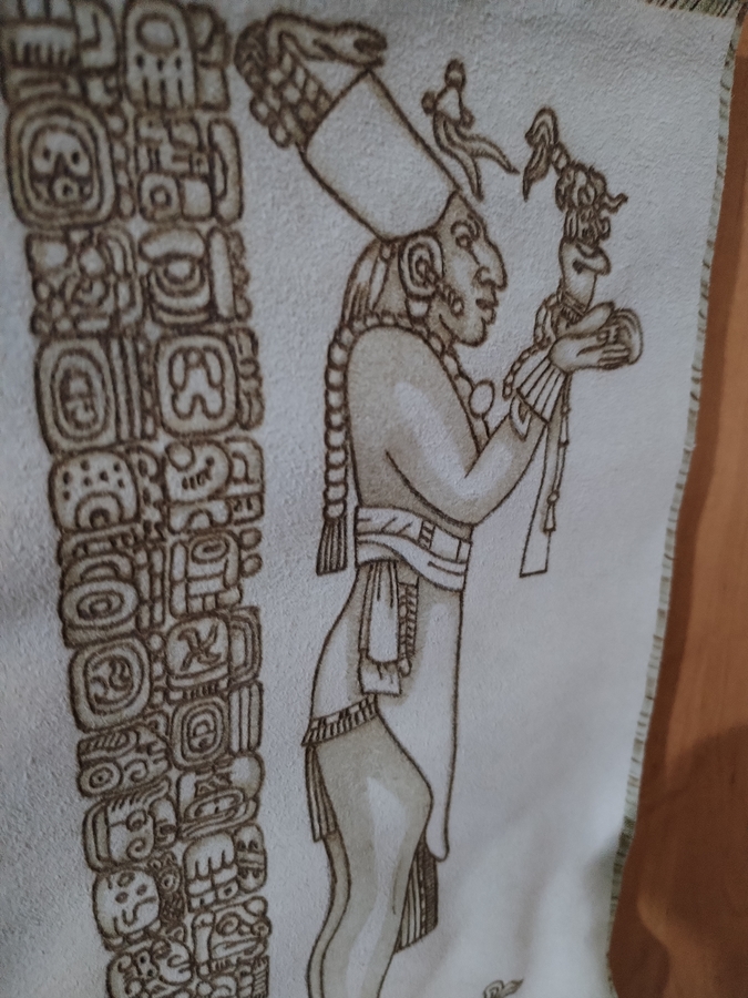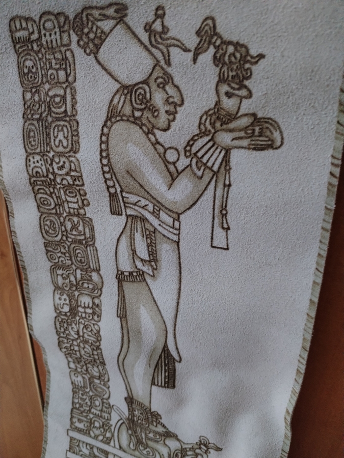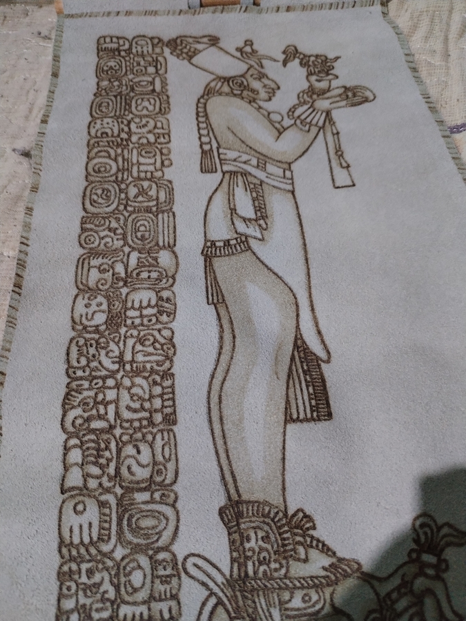 Tablou artizanal gravat, Palenque, Mexic, cultura Maya, realizat pe piele naturala tip suede de vita, reprezentind-ul pe Chan Bahlum al II-lea, fiul lui Pakal, regele orasului stat Palenque din Chiapas Mexic.