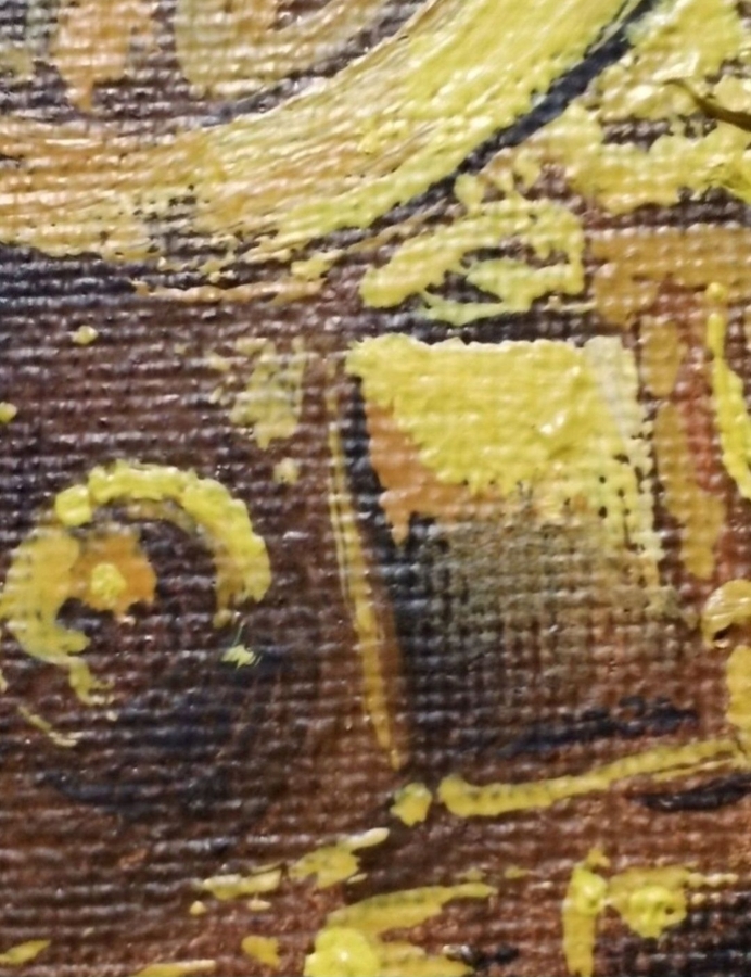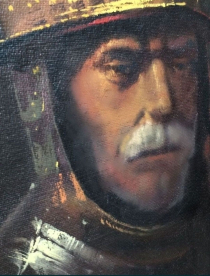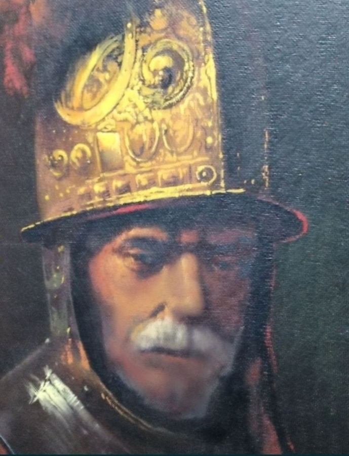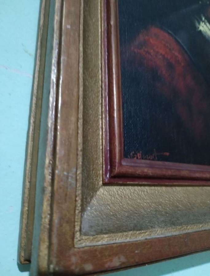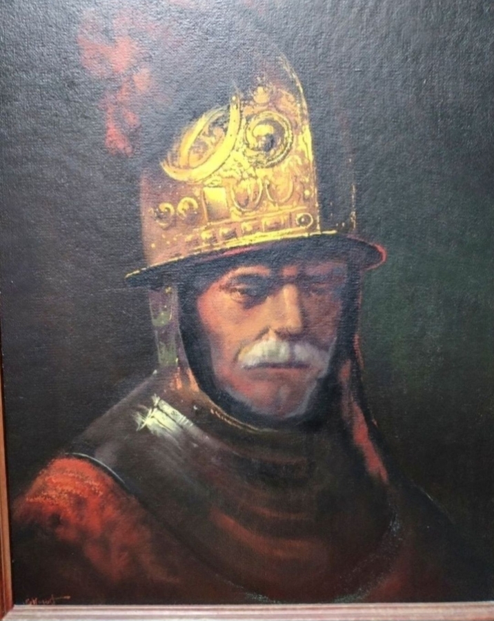 Pictura veche, pictat in ulei pe panza lipita pe MDF (MDF maruflat), si semnata. Opera realizata dupa o lucrare initial atribuita lui Rembrandt, apoi discipolilor si intitulata Omul cu coif de aur. Rama din lemn masiv. Dimensiuni tablou 60x50x5cm.