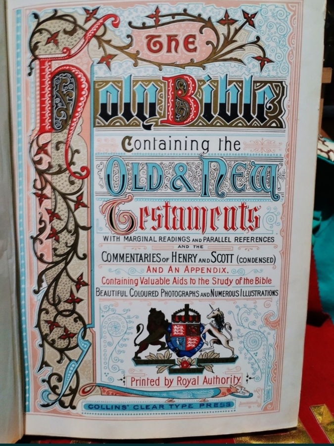 Editie de lux cu pagina policroma, cu blazonul leului si unicornului, plus mentiunea ,,Colins'' Clear-Type Press, cu mentiunea oficiala, Printed by Royal Authority.