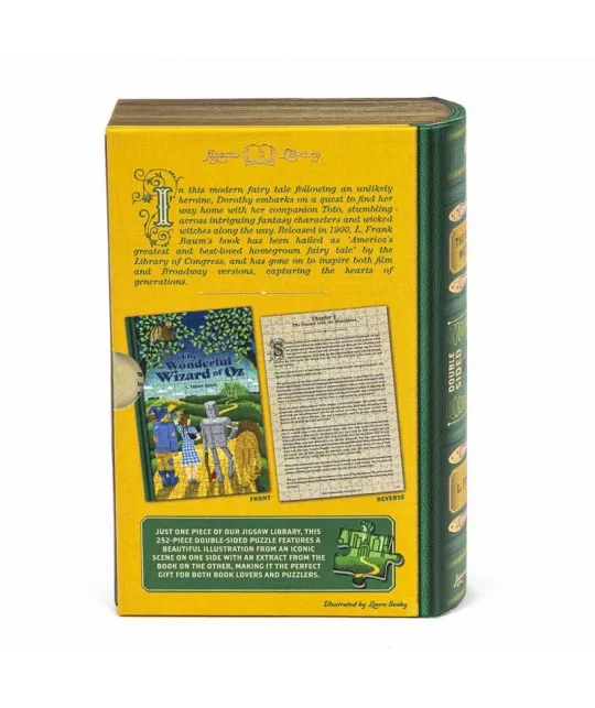 Puzzle-ul are 2 fete: o superba illustrate, o scena reprezentativa din roman iar pe a doua fata este pagina 13, celebra carte The Wonderful Wizard of Oz scrisa de L. Frank Braum, varianta originala in limba engleza, exact asa cum a fost tiparita in anul 1900. Piesele sunt ambalate intr-o cutie superba tip carte, roman.