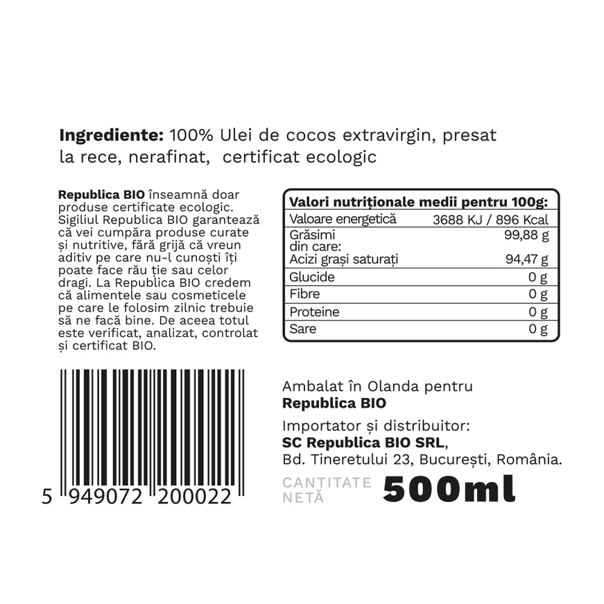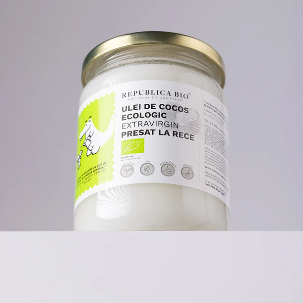 Uleiul de cocos extravirgin Republica BIO este obtinut prin presare la rece din pulpa proaspata de nuca de cocos, organica, fara a fi supus rafinarii, inalbirei sau aditivarilor. Certificat ecologic conform standardelor stricte ale Uniunii Europene, acest produs pastreaza intacte toate proprietatile nutritive, fiind ideal pentru dietele vegane si raw-vegane.