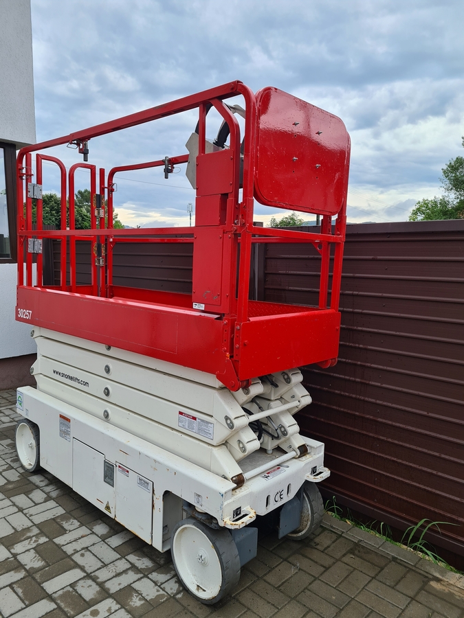 marca Snorkel 3226E, an fabricatie 2016, inaltime de lucru 10,8 m + h, anpatament 600 mm, platforma extensibila +1,1 m, masa ridicare pe platforma 245 kg, viteza I / II 1 - 3,5 m/s, masa totala 2,4 t, comanda ridicare/coborare de urgenta, comenzi externe via joystick, telecomanda cu fir, cauciucuri cu fata plana pentru incinte de interior si externe betonate,