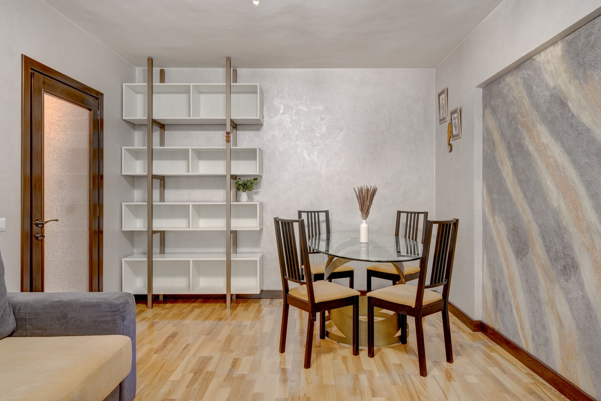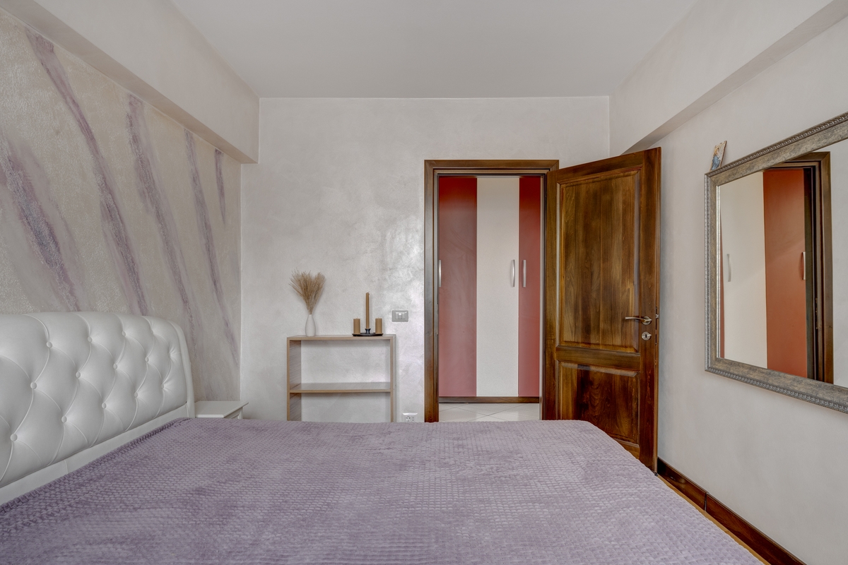 Peretii sunt finisati cu vopseluri decorative stucco veneziano si stressa, care adauga textura, profunzime si un aer rafinat intregului spatiu. Usile din lemn de cires, lucrate manual, completeaza atmosfera calda si coerenta a apartamentului.