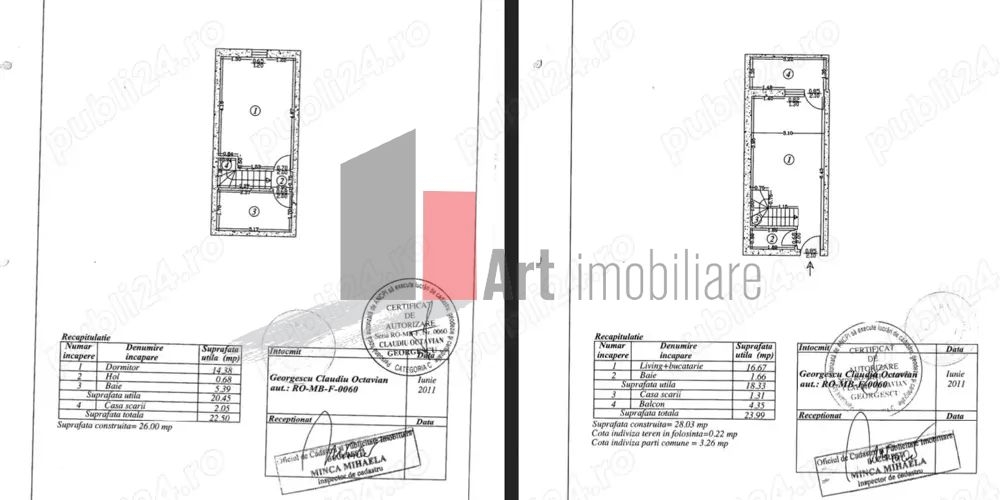 Suprafatele pe fiecare nivel sunt: nivel 1: 23,99 mp; nivel 2: 22,50 mp.