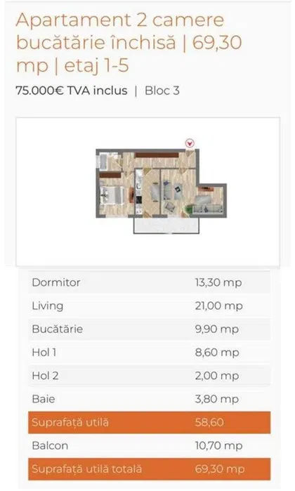 Apartament 2 camere bucatarie inchisa | 69,60 mp | etaj 1-5
