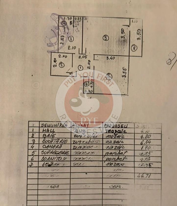 Podele: parchet, gresie | Pereti: faianta, var/huma | Ferestre: pvc