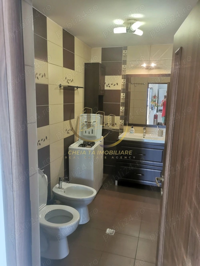 - 2 bai (baie principala de 6,8 mp si baie de serviciu de 3 mp, cu spatii de depozitare)