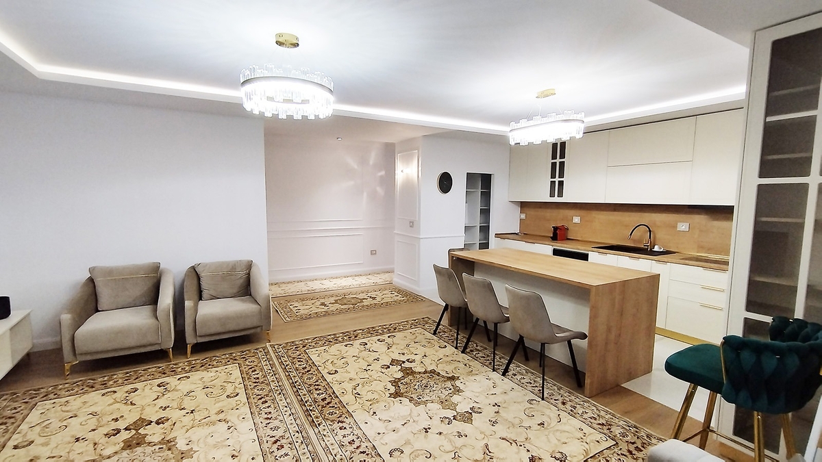 Apartamentul se afla la parterul unui imobil cu regim de inaltime P+11E, situat langa hotelul Phoenicia Grand Hotel, in zona bulevardelor Ficusului si Aerogarii. Este decomandat, are o suprafata de 123 mp si este complet orientat catre est. Are un living cu balcon integrat si bucatarie deschisa, cu suprafata de 44 mp, doua dormitoare de 18 mp si 34 mp si doua bai. Apartamentul este recent renovat, mobilat si complet utilat, nu a fost locuit, iar finisajele, mobilierul si electrocasnicele sunt de foarte buna calitate.