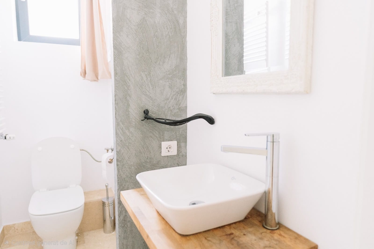 La interior, toate compartimentarile sunt din caramida. Usile de interior sunt Pinum. Toate obiectele sanitare / baterii / dus / cada sunt Ideal Standard.