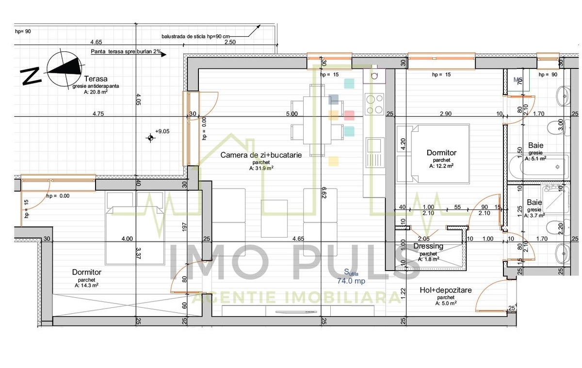 - 74 mp utili + 20.8 mp terasa, 2 bai, dressing, Et. 3. Pret : 129.500 Euro;