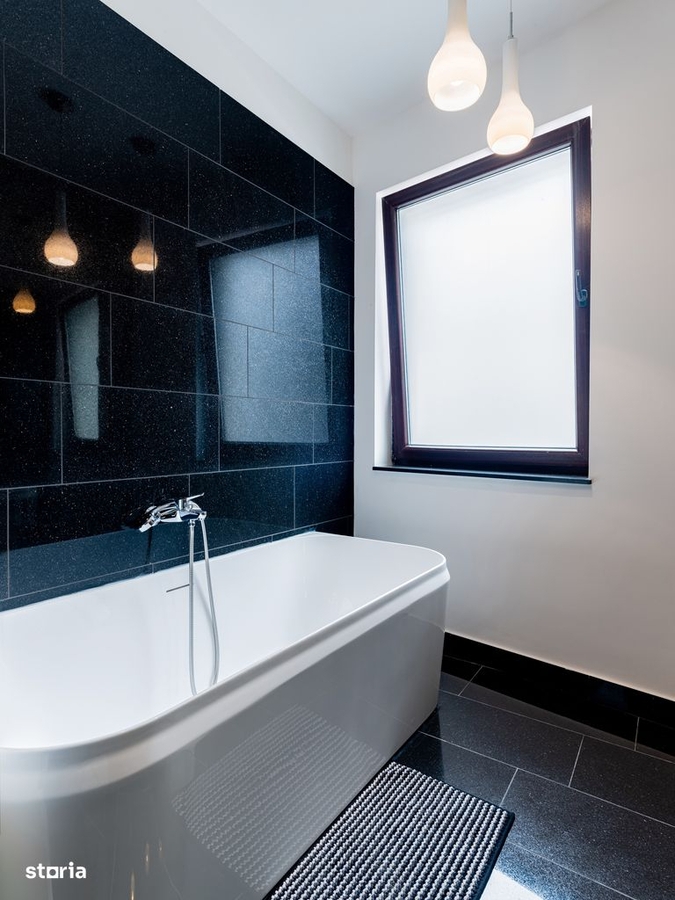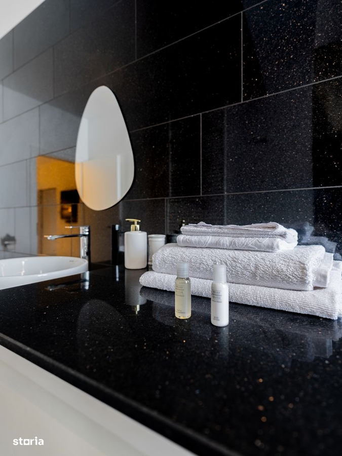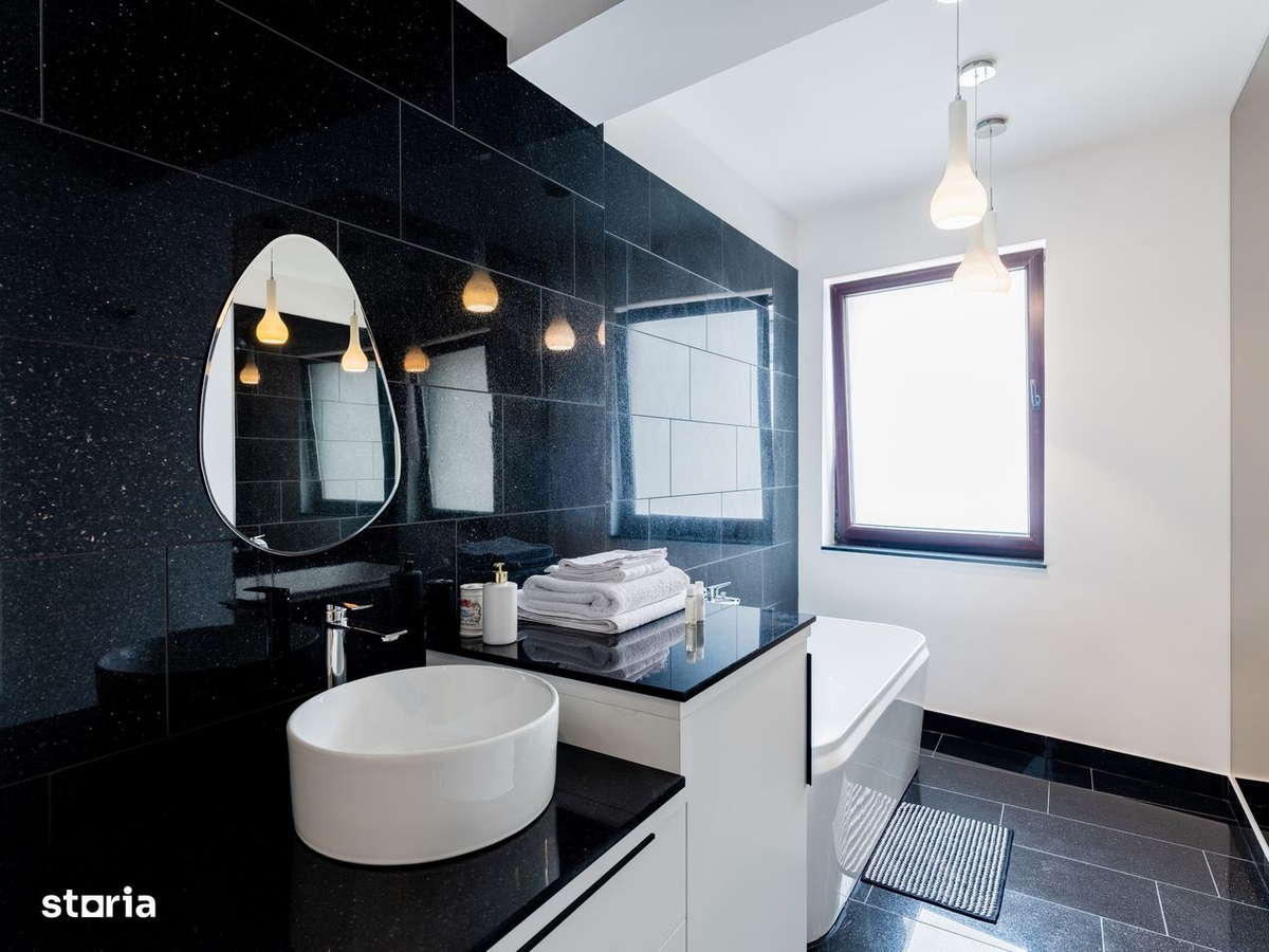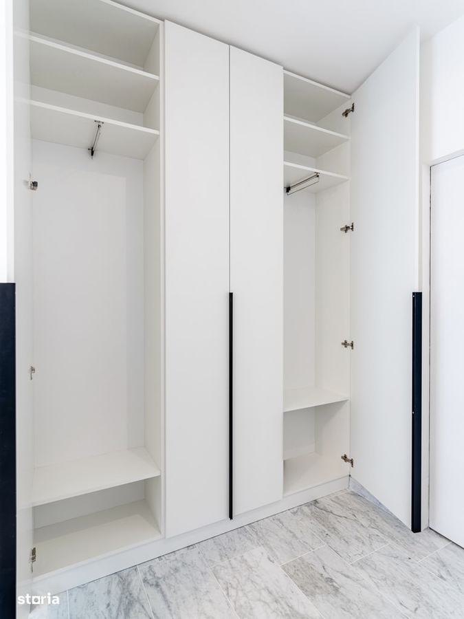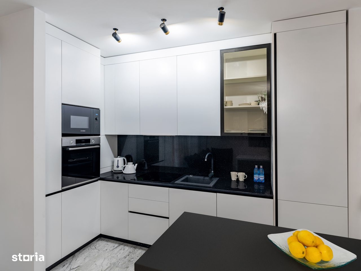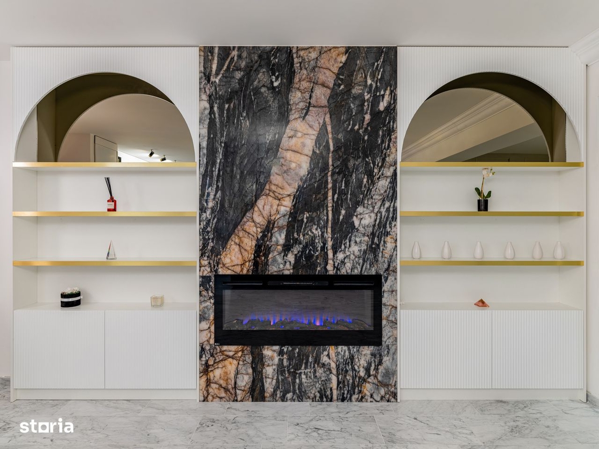 Proprietatea impresioneaza prin designul interior premium si atentia la detalii. Apartamentul este complet mobilat si utilat, beneficiind de electrocasnice moderne: masina de spalat, masina de spalat vase, frigider, plita, cuptor, hota, semineu si TV. Mobilierul realizat la comanda din MDF, semineul din quartz, blaturile de granit si pardoseala integral placata cu marmura Carrara definesc un stil elegant si contemporan. Confortul este completat de incalzirea in pardoseala, usile Filomuro, canapeaua Edra si masa de dining din marmura.