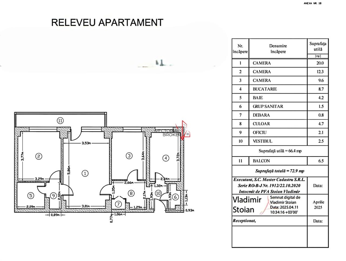 Vectorial Broker va prezinta un apartament cu 3 camere, 67 mp utili, 73 mp totali, semidecomandat. Doua bai (da, doua!), un balcon mare in care incape lejer o masuta cu doua scaune