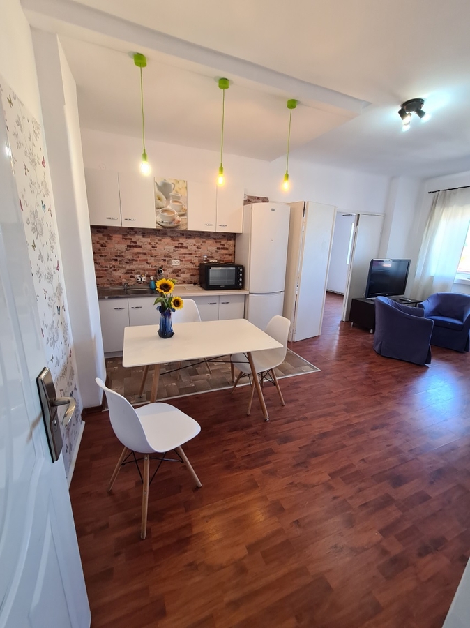 In Piata Kogalniceanu apartament de 4 camere impartita in 2 apartamente de cate 2 camere, pretabil si ptr. regim hotelier, total suprafata utila 98.5 mp, vedere spate cu balcon inchis spre Casa Poporului, Parcul Izvor si Dambovita, iar spre fata cu balcon deschis semi acoperit pe bulevard si piata M. Kogalniceanu. Apartamentul a fost renovat, utilat si mobilat in anul 2017 (pozele sunt facute dupa renovare), are 2 dormitoare, 2 camere de zi, 2 bucatarii, 2 bai, 2 balcoane, 2 intrari. Are centrala termica proprie noua. Nu are risc (R) seismic, este incadrat pe lista Primariei cu Urgenta 2 (insa este consolidata in 1978 pana la et. 4). Liftul este noua. Statii de autobuze si trolee in rondul Kogalniceanu la ½ minut de mers, metro Izvor la 4 minute de mers pe jos. Necesita renovare bucatariei si reinnoirea mobilierului. Pret de vanzare: 128000 Eu -
