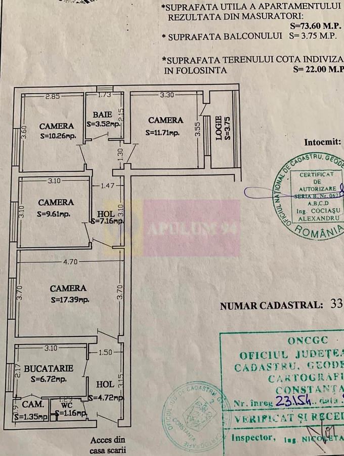 Va propunem spre cumparare un apartament cu un amplasament foarte bun in Constanta. Se vinde un apartament de 4 camere in proximitatea Lacului Tabacarie. Apartamentul se afla in zona de Nord a Orasului Constanta, in imediata apropiere a statiunii de vacanta Mamaia, la 10 minute de Aqua Magic Mamaia, in cartierul Tomis Nord chiar pe strada Suceava. La nici 2 minute este Parcul Tabacarie care margineste Lacul Tabacarie, cel care este langa Delfinariu, din Parcul Tabacarie ajungem in 5 minute prin parc la City Park Mall, o zona de shopping moderna. La un minut de bloc este statia pentru autobuzul 100 care ne ajuta sa ajungem oriunde in oras in cateva minute. La mica distanta de apartament - 5 minute, exista scoala (scoala 29), liceu (Liceul Decebal)si facultate (Facultatea de Medicina Ovidius), apartamentul fiind ideal pentru o familie cu 2 sau 3 copii. Blocul a fost anvelopat acum cativa ani si nu sunt probleme cu teresa. Este situat la etajul 3 al unui bloc solid de 3 etaje constructie 1967-1970. Apartamentul nu are modificari si nici imbunatatiri, se poate transforma cu investitia potrivita in caminul ideal. Suprafetele sunt optime pentru confortul persoanelor care vor locui in apartament, avem doua dormitoare de aproximativ 10metri patrati si un dormitor matrimonial spatios cu balcon propriu tip logie cu vedere spre o zona verde. Livingul are in jur de 18mp iar bucataria este inchisa si beneficiaza camara. Apartamentul are documentatie cadastrala si este intabulat, pentru mai multe informatii si programarea de vizionari nu ezitati sa ma contactati, Daniel, Apulum94.