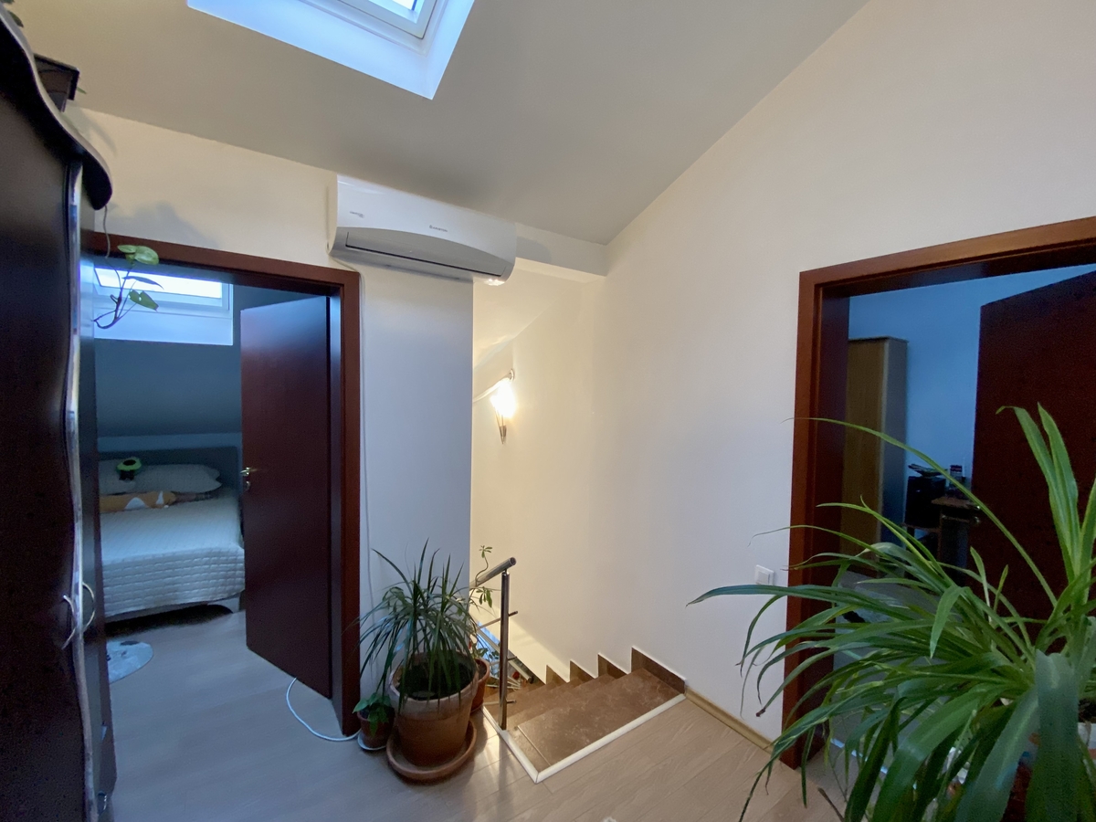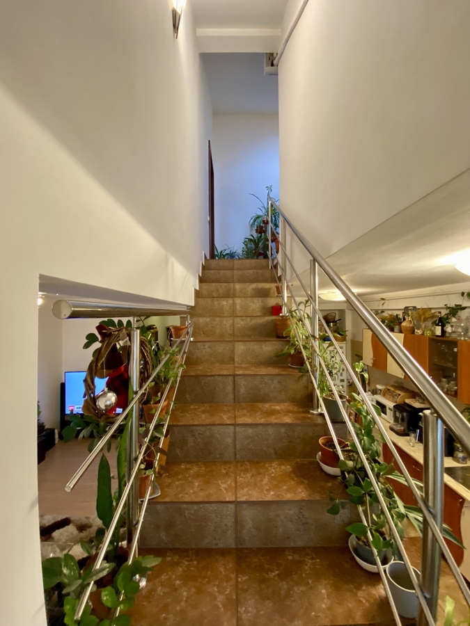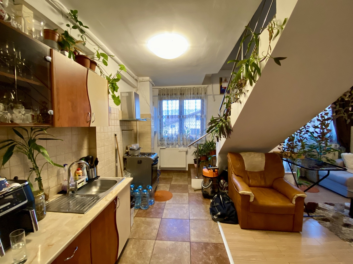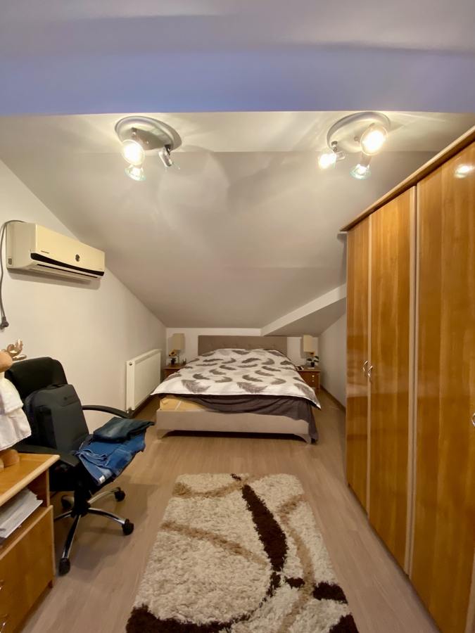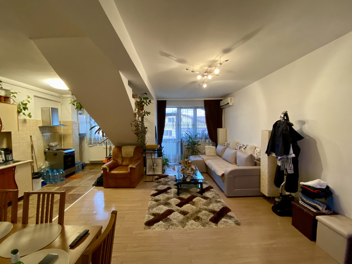Locuinta se desfasoara pe 2 niveluri, cuprinzand o zona de zi la parter cu living, baie, bucatarie, loc de luat masa, balcon si o zona de odihna si relaxare la etaj, cu 3 dormitoare, complet mobilate.
