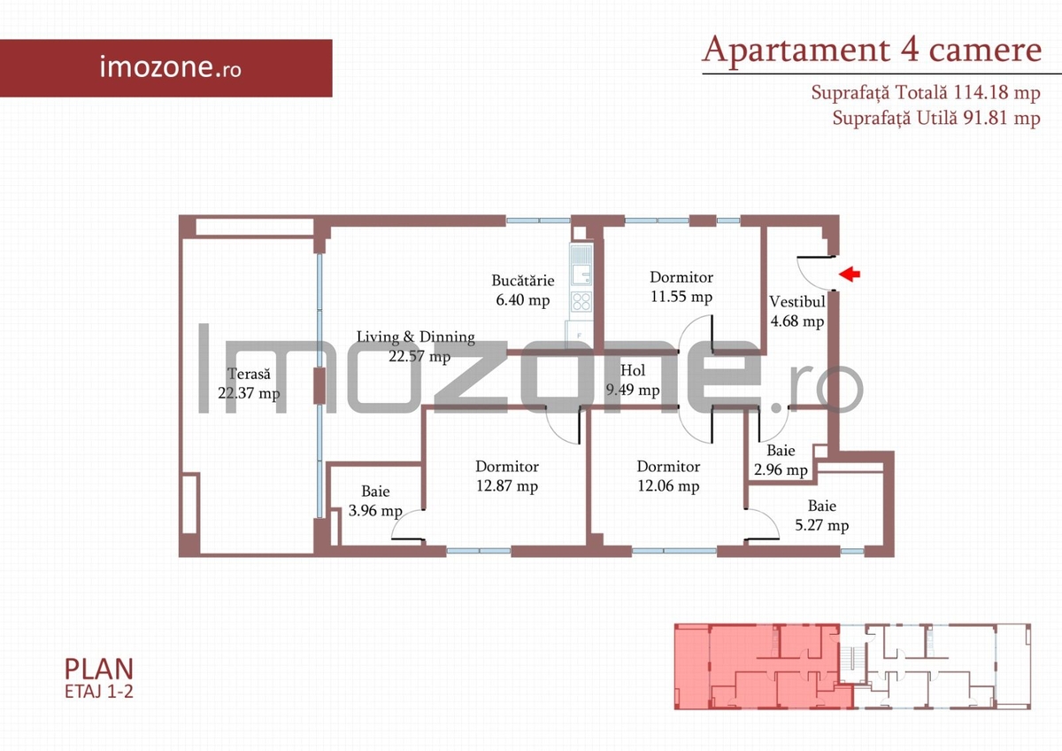 Apartament cu 4 camere, 3 bai, 1 terasa, decomandat, 92 mp + terasa de 22 mp, finisat complet, cu posibilitatea de a alege finisajele!