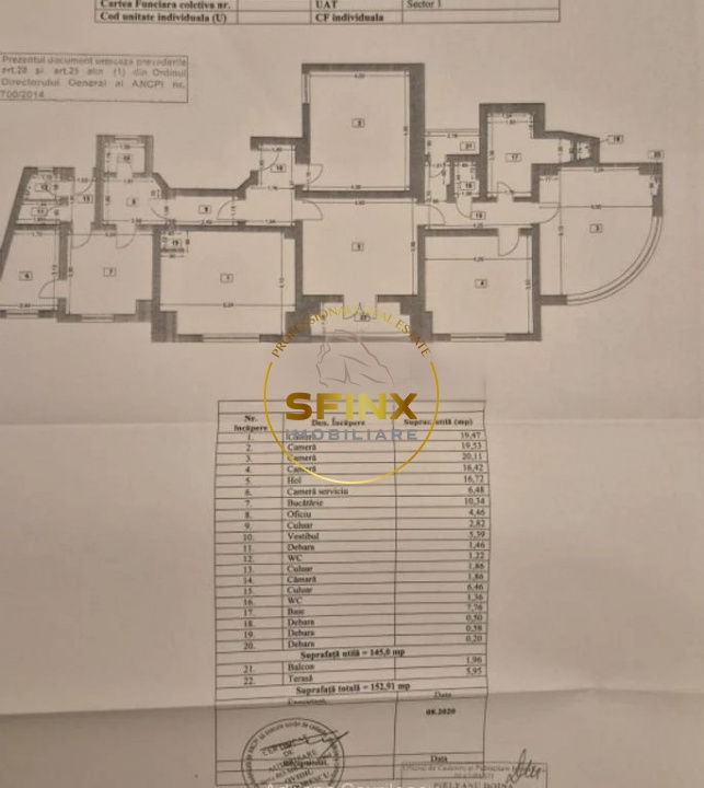 Suprafata totala a apartamentului este de 152,91 mp (conform releveu actualizat 2020).