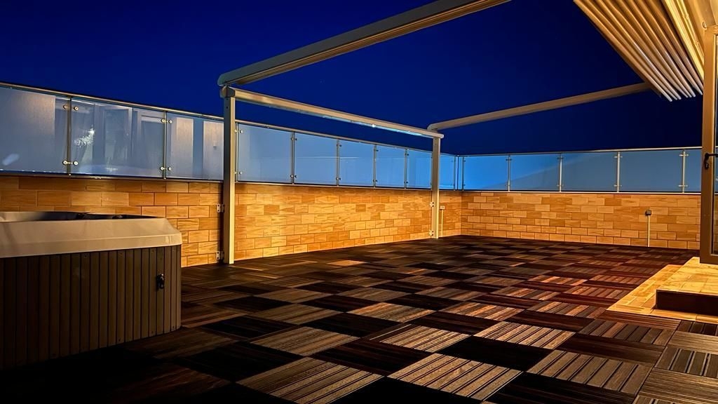 Se afla pe intreg etajul, finisat si echipat cu materiale de cea mai buna calitate: Tamplarie aluminiu cu vitrare ampla marca Schuco, piatra naturala de calitate premium, mozaic de colectie, parchet din lemn si terase exterioare cu decking din lemn natural de teak.