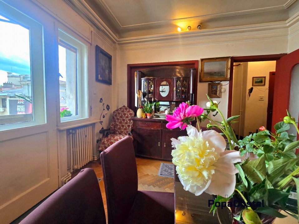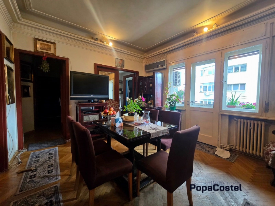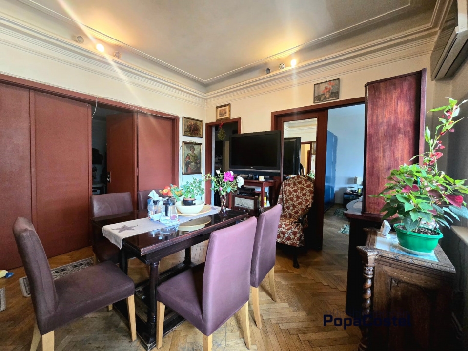 Ocazie! Piata Lahovari - George Enescu vanzare apartament generos, cu personalitate, situat la etajul 2 al unui imobil interbelic cu 3 etaje, construit in perioada 1930-1940, dotat cu lift si interfon. Apartamentul este de tip semidecomandat si are 145 mp utili. Este compus din 4 camere luminoase, o bucatarie spatioasa, 1 baie cu cada si 2 WC de serviciu, numeroase spatii depozitare (debarale, camara, holuri) si 2 balcoane ideale pentru relaxare. Apartamentul este renovat si dispune de aer conditionat, parchet, gresie, faianta, centrala proprie. Ferestrele, dotate cu tamplarie din lemn si rolete, contribuie la pastrarea farmecului autentic al locuintei. Acest apartament combina farmecul interbelic cu facilitati moderne, oferind un spatiu ideal pentru cei care apreciaza confortul si stilul clasic. Suntem agentie imobiliara si percepem comision. Mai multe oferte, detalii si informatii gasiti pe site-ul nostru: PopaCostel.ro