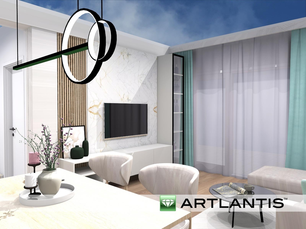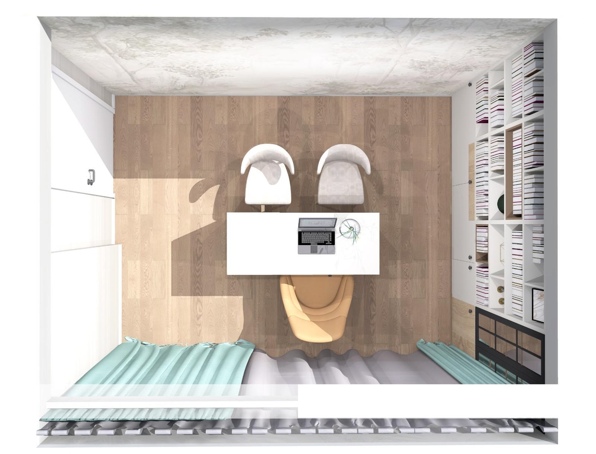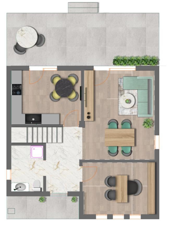 Parter: living, bucatarie, hol, baie, 2 terase, birou