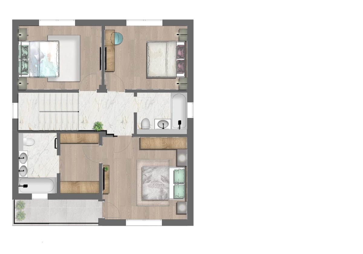 Etaj: dormitor 1, dormitor 2 dormitor 3 matrimonial cu baie dressing si balcon, baie pe hol
