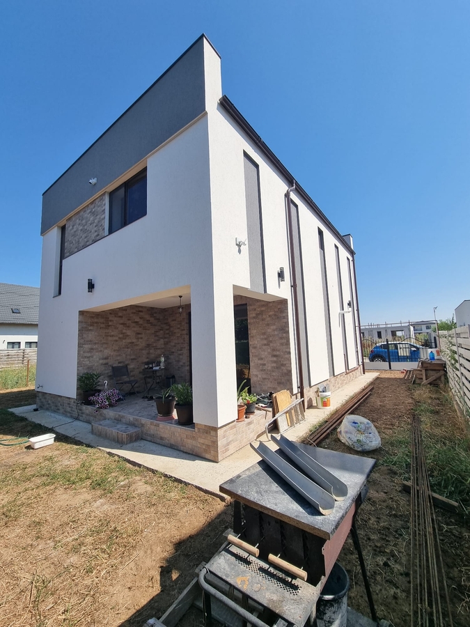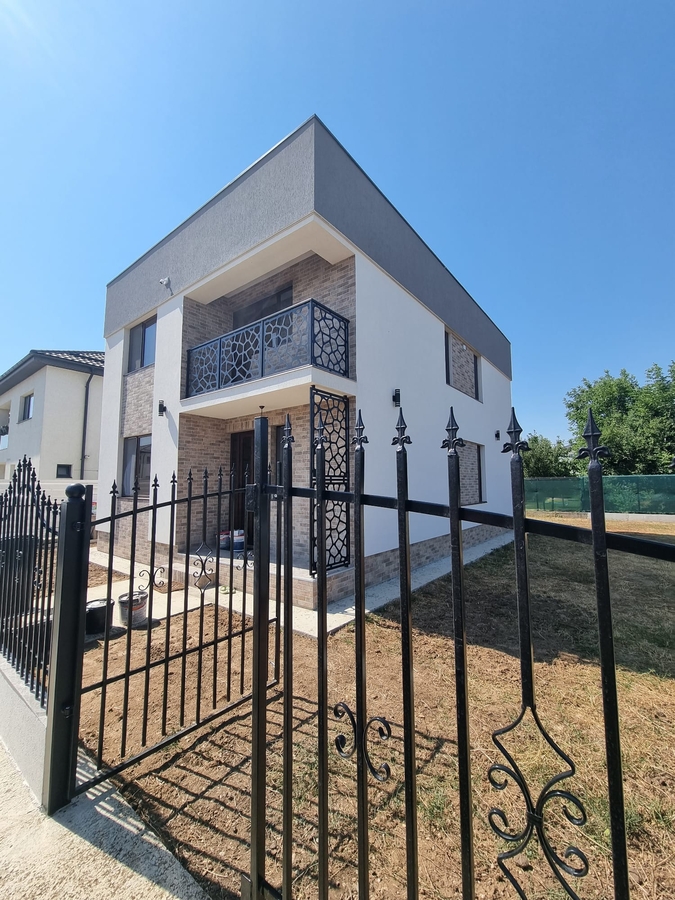Casa de vanzare cu posibilitatea de mutare imediat, constructie finalizata 2025 cu parter si etaj, finisaje premium, camere supraveghere, iluminat exterior, fosa septica, gaze naturale, apa, curent electric trifazat, vecini pe toate laturile, zona linistita si foarte aproape de oras, supermarket foarte aproape (Peny, Carrefour, Mega si Lidl), scoli si gradinite, transport public (STB)