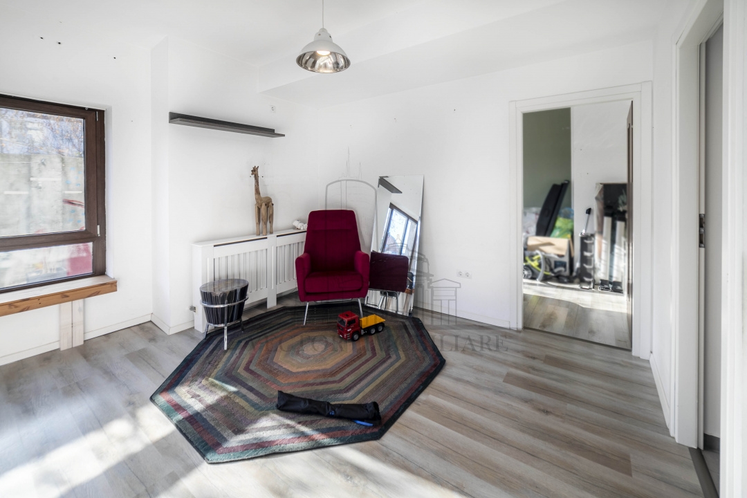 Accesul in imobil se face printr-un hol generos, care comunica frontal cu livingul de la parter si ofera, totodata, acces catre scara ce deserveste etajele 1 si 2. Livingul de la parter include o bucatarie deschisa si comunica cu o camera de zi de aproximativ 12 mp, precum si cu o baie de peste 5 mp. Din zona de living se realizeaza accesul catre o aripa separata a etajului 1, unde se afla un dormitor de aproximativ 11 mp, cu baie proprie.