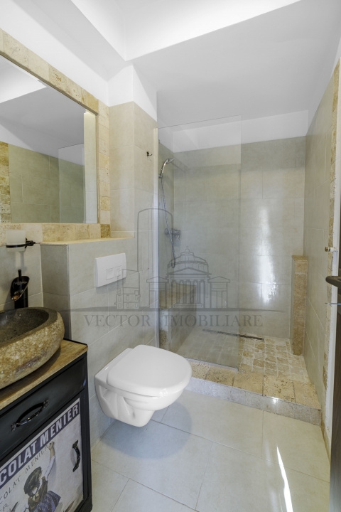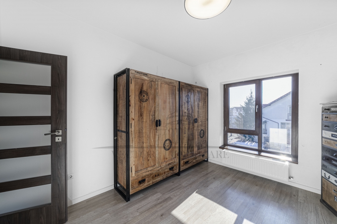 Arhitectura este moderna, adaptata standardelor actuale de locuire, cu o compartimentare extrem de eficienta: patru dormitoare deservite de patru bai, acces diferentiat catre etaje si o organizare care permite utilizari multiple – locuinta de familie, resedinta multifunctionala sau investitie. Amenajarile interioare au fost realizate cu materiale naturale atent alese, precum piatra, lemnul si travertinul, care confera un caracter cald si elegant intregii proprietati.