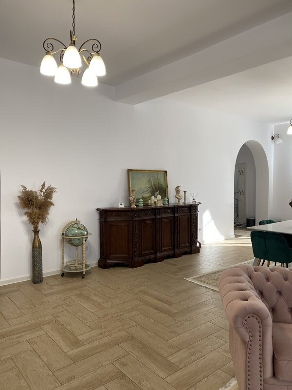 Parter - living 59 mp, dormitor 15 mp, baie 5 mp, 3 holuri 3-4 mp, spalatorie 7 mp, camera tehnica 4,5 mp si bucatarie 25 mp.