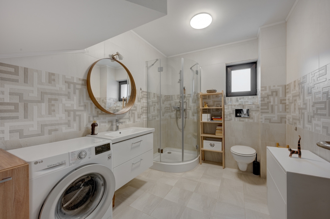 Ambele grupuri sanitare au ferestre pentru aerisire naturala. Baia de la parter este amenajata cu cabina de dus iar baia etajului este amenajata cu cada.