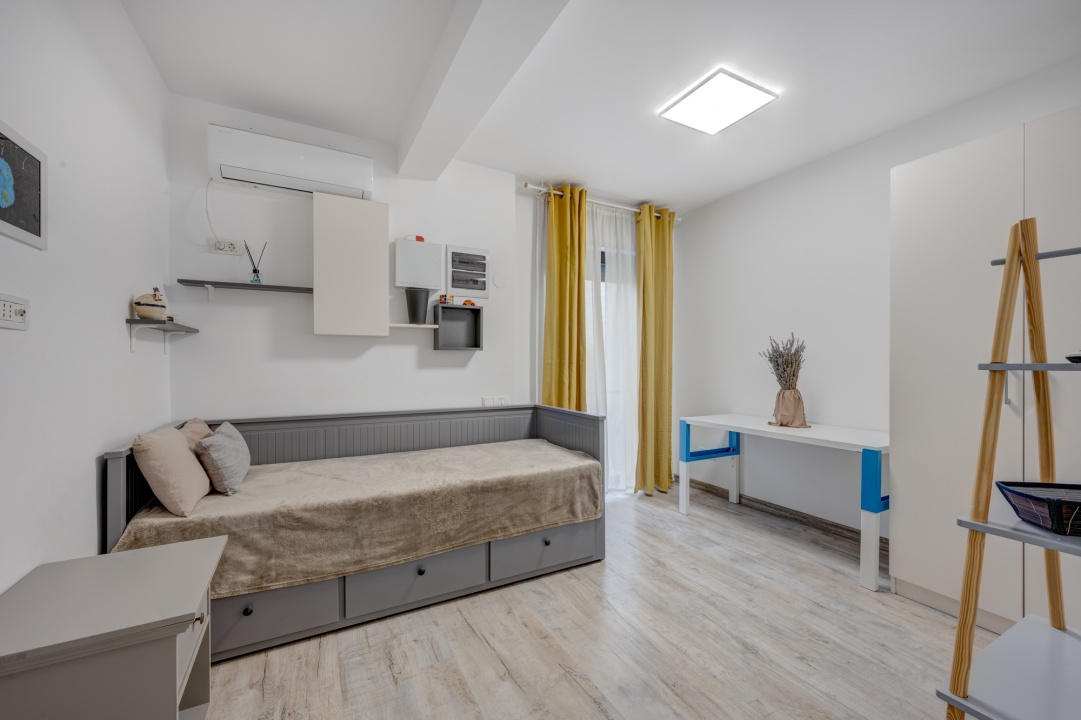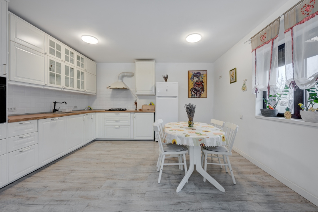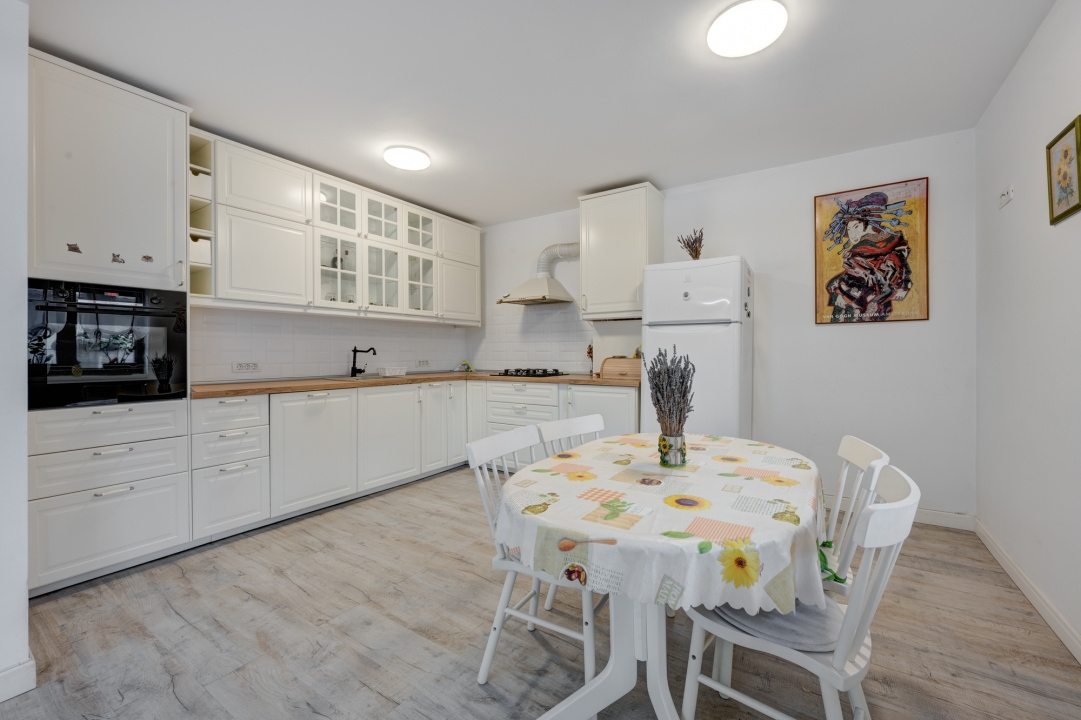 Bucataria este generoasa, mobilata Ikea si echipata cu toate electrocasnicele necesare: plita, cuptor, hota, masina de spalat vase, frigider. Tot in bucatarie este amenajat un loc pentru luat masa pentru 4 persoane. Bucataria este deschisa cu livingul dar exista si posibiitate de inchidere, la nevoie. Livingul este amenajat cu 2 canapele si comoda cu TV. Cele 3 dormitoare sunt complet mobilate.