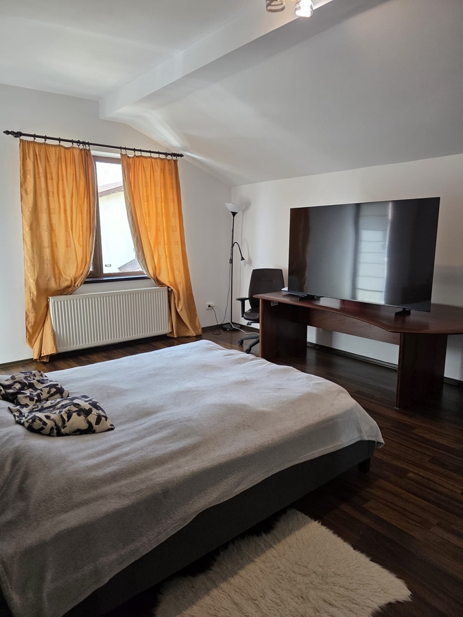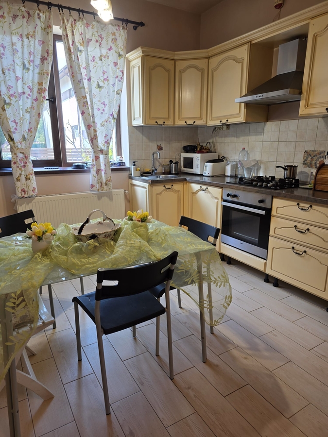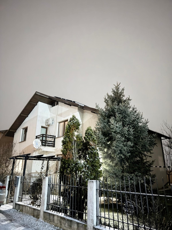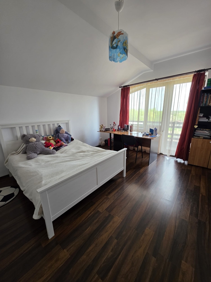 Vila spatioasa P + 1, cu o suprafata utila de 200 mp si suprafata totala de teren 550 mp, localizata intr-o zona linistita, in apropiere de Paradisul Verde, cu vedere spre lac / domeniu de pescuit. Parterul este format din living, bucatarie, un dormitor, o baie si camera tehnica, iar la exterior o terasa spatioasa care are acces din living. La etaj sunt trei dormitoare generoase cu suprafete de 20 – 24 mp / fiecare, doua balcoane, doua bai, un birou si dressing. Ideala pentru familii care au nevoie de spatiu, casa este eficienta energetic, avand izolatie de polistiren de 15 cm, geamuri tripan, centrala termica pe gaz noua, panouri solare de 7.2 kw si baterie de stocare de 5 kw. Exista spatiu suplimentar de depozitare in pod si o casuta de gradina.