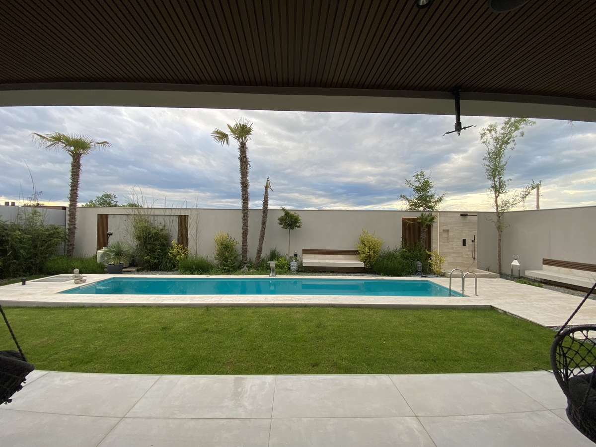 Piscina tip culoar de inot, incalzita, iluminata LED RGB, cu fantana de masaj, dus exterior, robot automat
