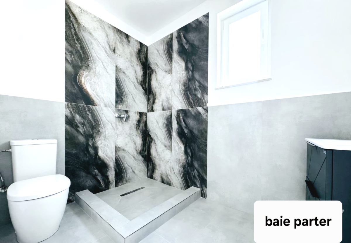 Etaj: 2 dormitoare, o baie pe hol si un dormitor matrimonial cu baie proprie.
